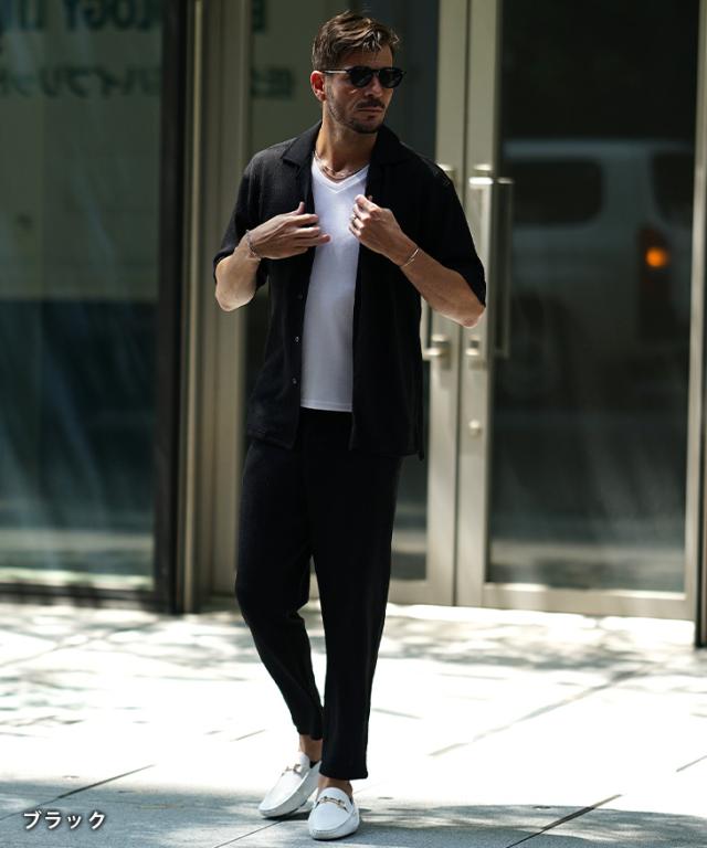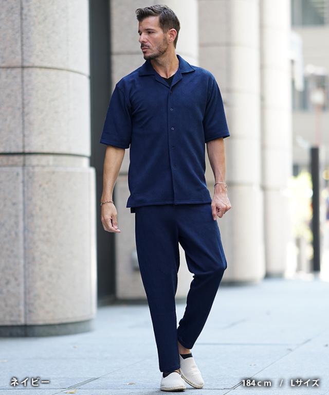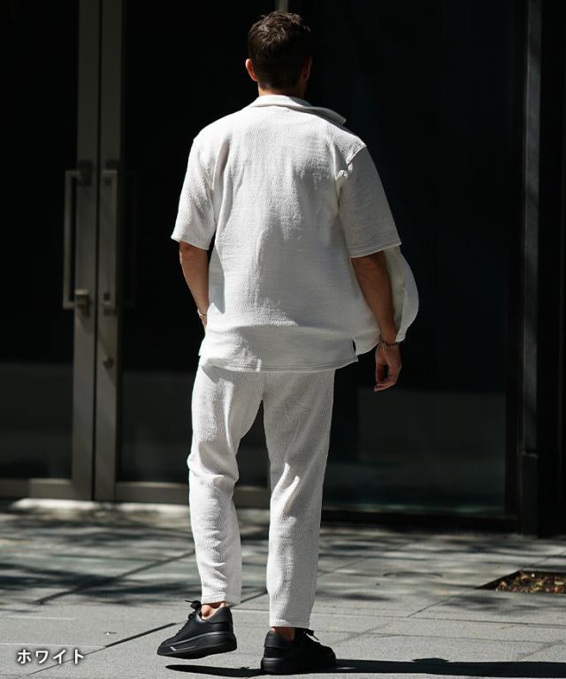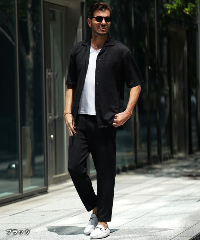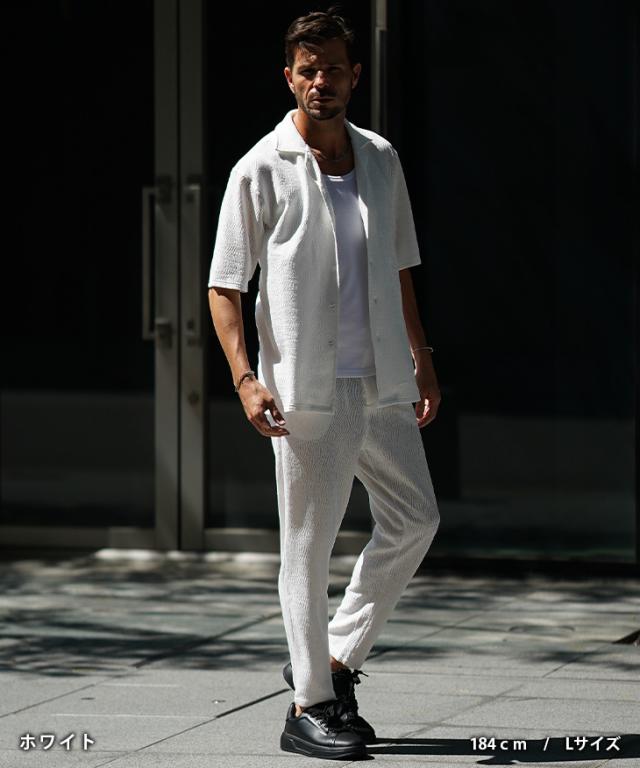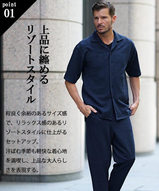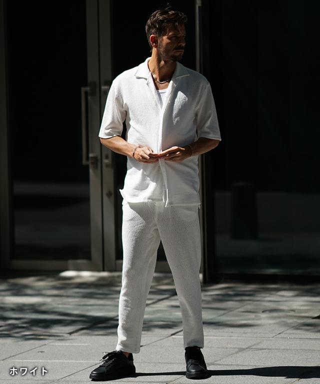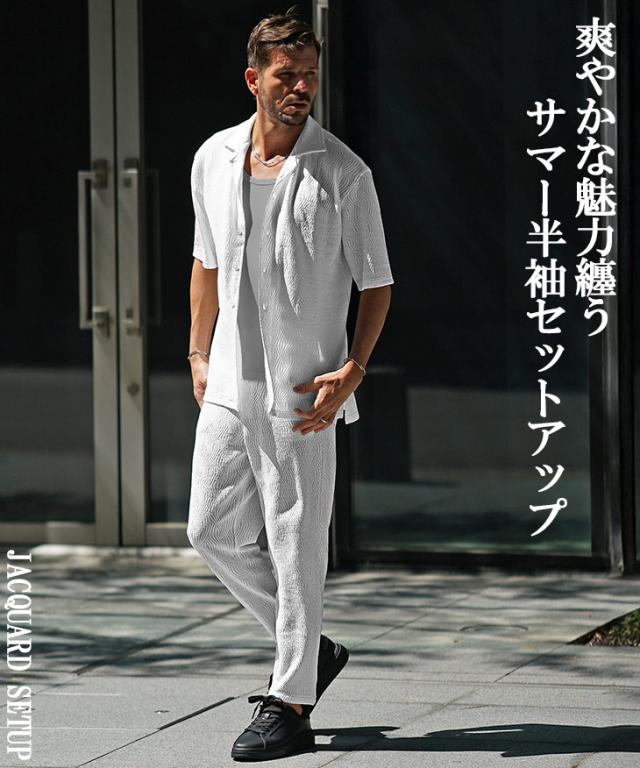 爽やかなオトナの軽快スタイル『ジャガードシャツセットアップ』【ジャガード開襟シャツセットアップ】■Design/デザイン爽やかな魅力を纏う開襟シャツとスラックスのセットアップ。透け感のある薄手な素材感で仕上げることで汗ばむ季節も軽快な着心地を実現。程よいリラックスシルエットで、夏のスタイルも上品にまとめる。ジャガード織りで生地全体に柄をデザインしさりげなく存在感を発揮するのもポイント。半袖シャツは、リゾートなムード溢れる開襟仕様で、スラックスは前開きながら、お腹周りもラクなイージータイプ。軽やかに季節を着こなすセットアップを、スマートなオトナに捧げる。