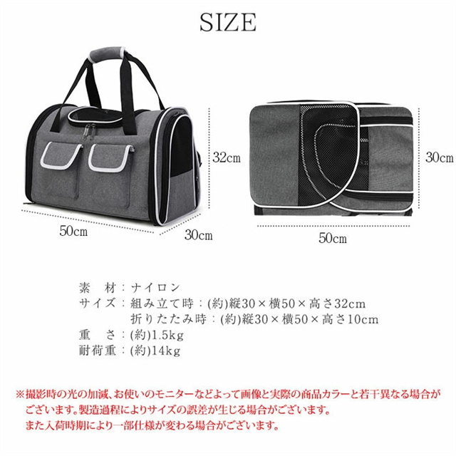 ◆素材 ナイロン ◆サイズ (約)縦30×横50×高さ32cm 折りたたみ時:(約)縦30×横50×高さ10cm 重さ:(約)1500g ◆その他詳細 開閉:ファスナー 内側:飛び出し防止用リードロック×1 外側:ポケット×2 耐荷重:(約)14kg |