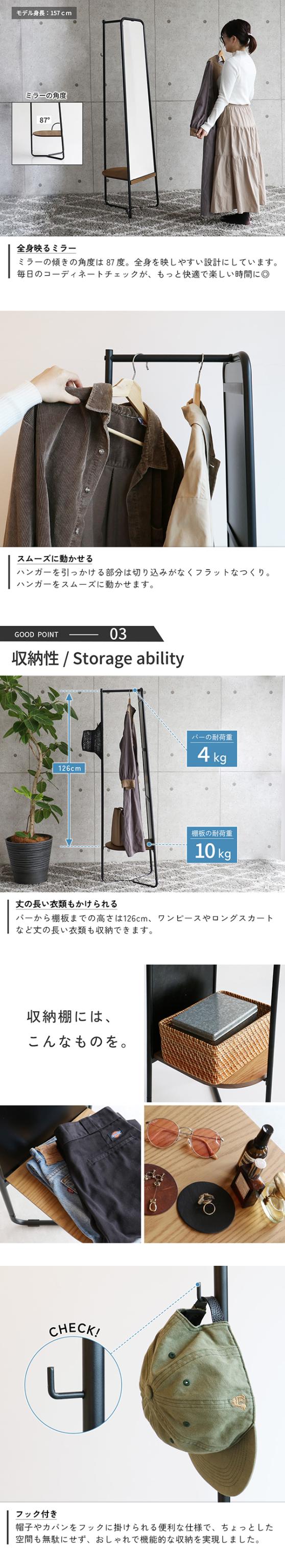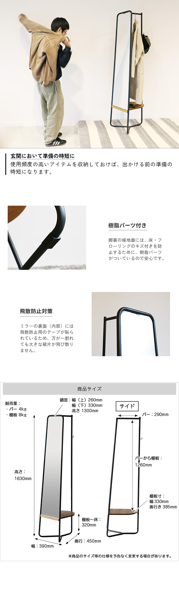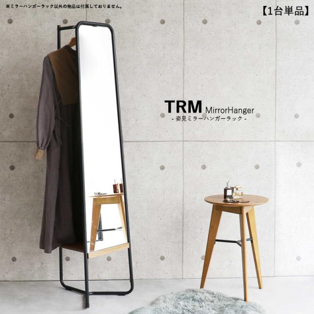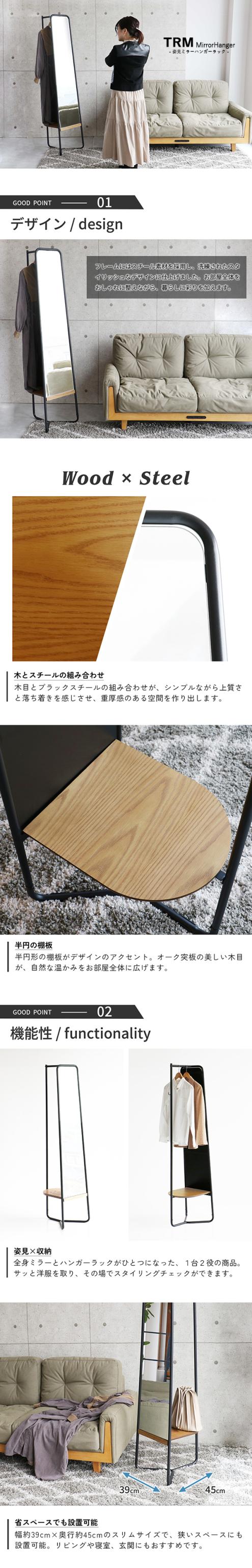 TRM ハンガーラック付きスタンドミラー【1台単品】 カラー| 棚:ナチュラル木地色・フレーム:ブラック 材料| スチール製 オーク材(突板) スリムタイプ 組立て商品 ハンガーラック 姿見