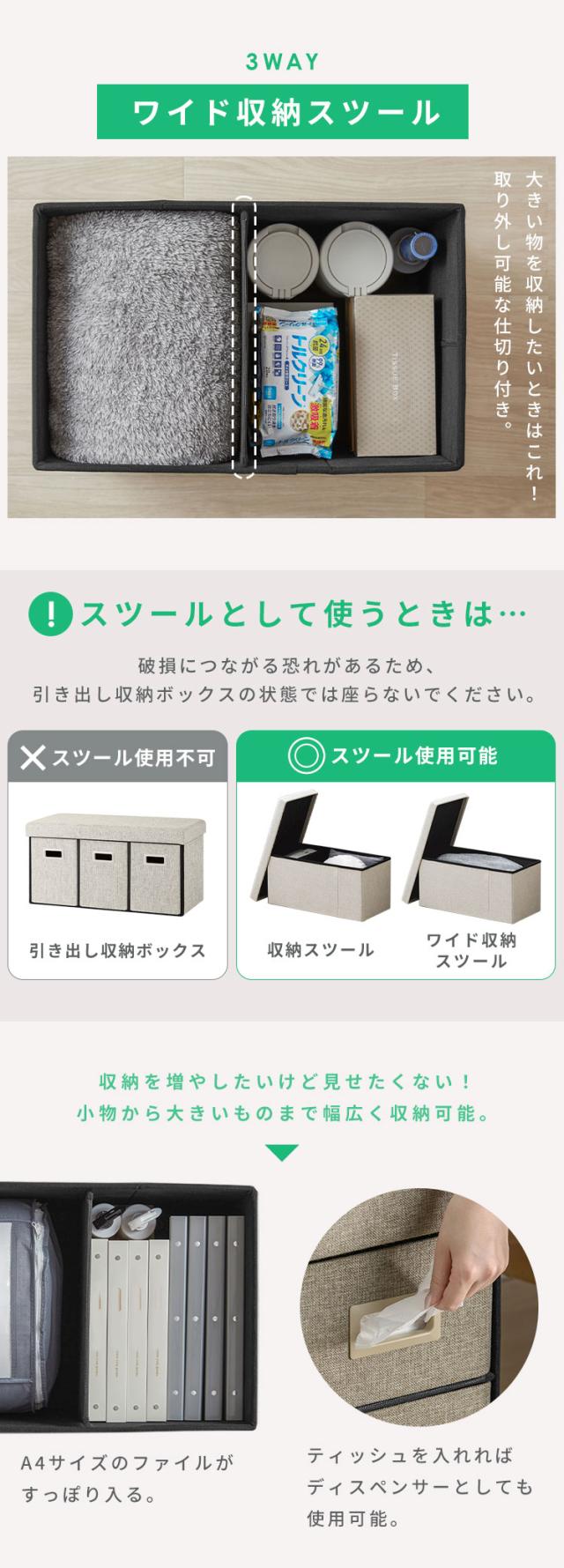 3/ワイド収納スツール:仕切りを外して大きなモノも収納可能。