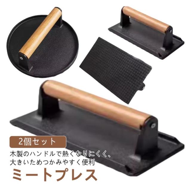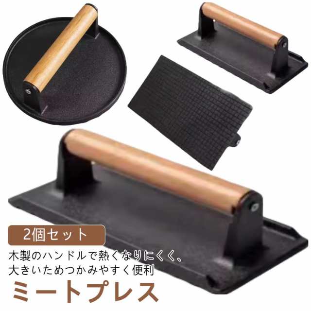 鋳鉄 ミートプレス 肉プレス ハンバーガープレス ベーコンプレス 2個セット 大型 重し 錆びない 食肉プレス プレス機 料理 2個セット ステンレス グリルミートプレス 木製ハンドル ハンドプレス 波型 海鮮 ホットサンド ステーキ 縮み