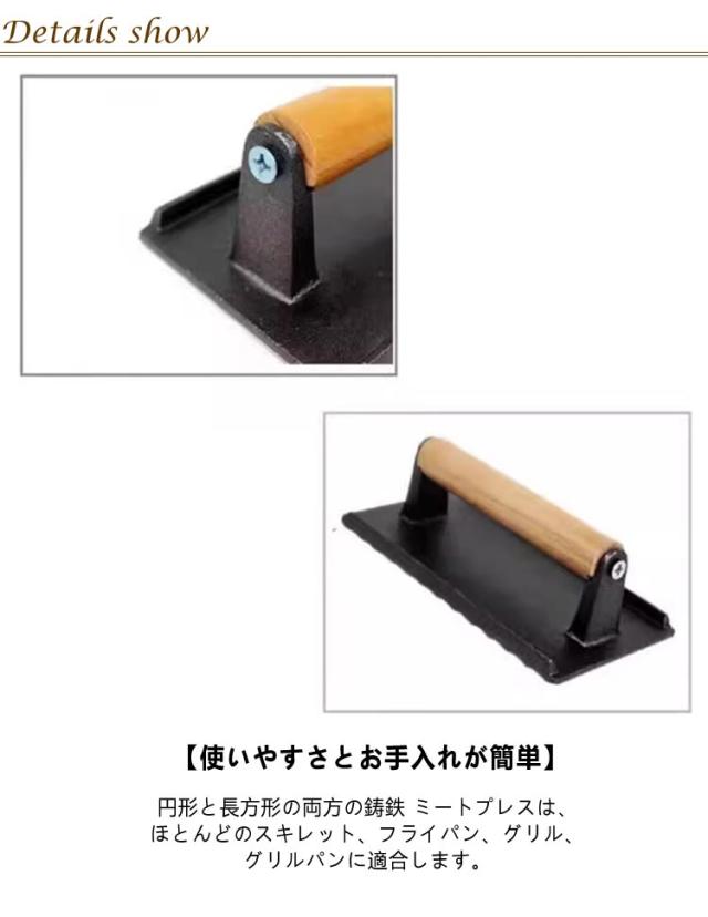 | 木製のハンドルで熱くなりにくく、大きいためつかみやすく便利 ミートプレス 2個セット 【鋳鉄 ミートプレス】これは頑丈な鋳鉄で作られた重量1KGの重し ミートプレスです。 プロのシェフグレードのフラットトップ グリル アクセサリーを使えば、経験豊富なプロのように肉を焼き、レストランのような食事を調理できます。 【快適なグリップの木製ハンドル】: 木製ハンドルは人間工学に基づいたデザインで、安全で快適なグリップを確保しながら手の疲労を軽減します。 天然木で作られた錆びない ミートプレスのハンドルはバリがなく滑らかで、熱伝導を遮断し耐熱性があり、触っても常に冷たさを保ちます。 鋳物 ミートプレスに2本のネジでしっかりと取り付けられています。 【特殊な溝面】:当社の大型 ミートプレスには、熱を均一に伝えて保持する特殊な溝面があり、ベーコンを簡単に平らにし、肉から脂肪を絞り出すことができます。 厚みが均一で焼き目も美しいハンバーグが作れます。 【使いやすさとお手入れが簡単】: 円形と長方形の両方の鋳鉄 ミートプレスは、ほとんどのスキレット、フライパン、グリル、グリルパンに適合します。 ミートプレスを予熱すると調理時間を大幅に短縮でき、ハンバーガー、ベーコン、ハム、グリルサンドイッチ、パニーニ、リブなどに最適です。 簡単かつ迅速に掃除できます。 【幅広い用途】: グリドル用ミートプレスは、プロの屋内キッチンや屋外バーベキュー、キャンプ用フラットトップグリルツールです。 ミートプレスは、グリル、グリドル、フラットトップ、鉄板焼き、スキレットパン、IHコンロなど、さまざまな表面で使用できます。 ベーコン、サンドイッチ、ハンバーガー、チキン、ステーキ、パニーニなどの食品に最適です。 | |