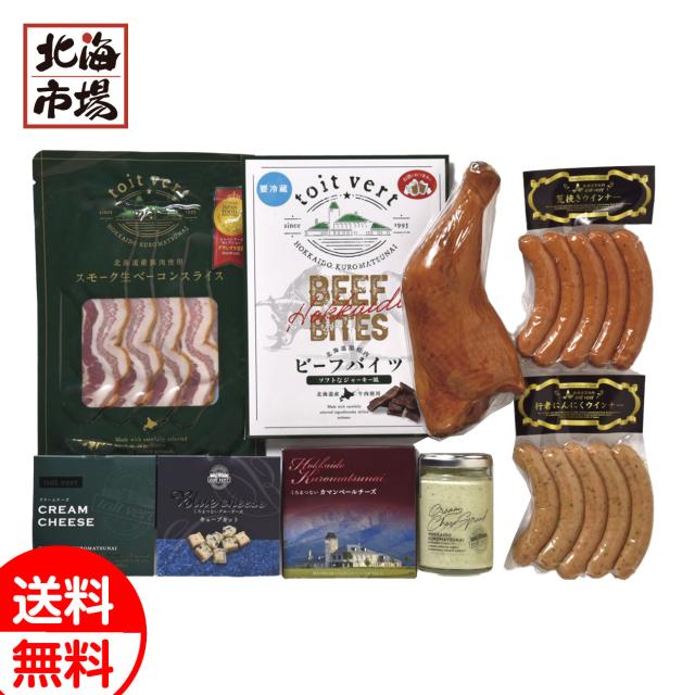 【内容】スモークチキン/250g、スモーク生ベーコンスライス/90g、ビーフバイツ/70g、くろまつないカマンベールチーズ/120g、クリームチーズスプレッド(バジル)/110g、くろまつないクリームチーズ/100g、ブルーチーズキューブ/50g、荒挽きウインナー・行者にんにくウインナー/各125g