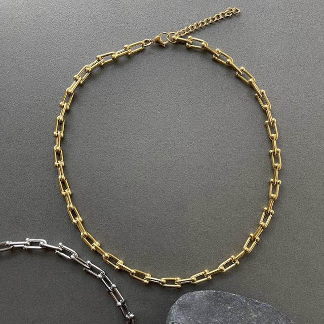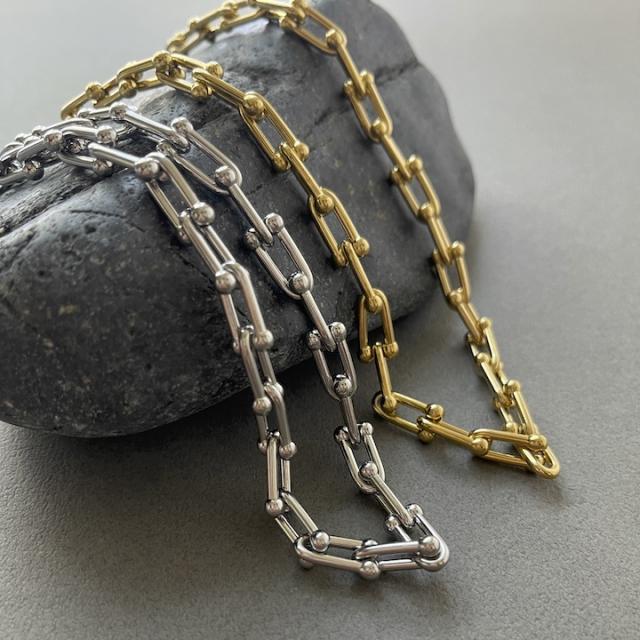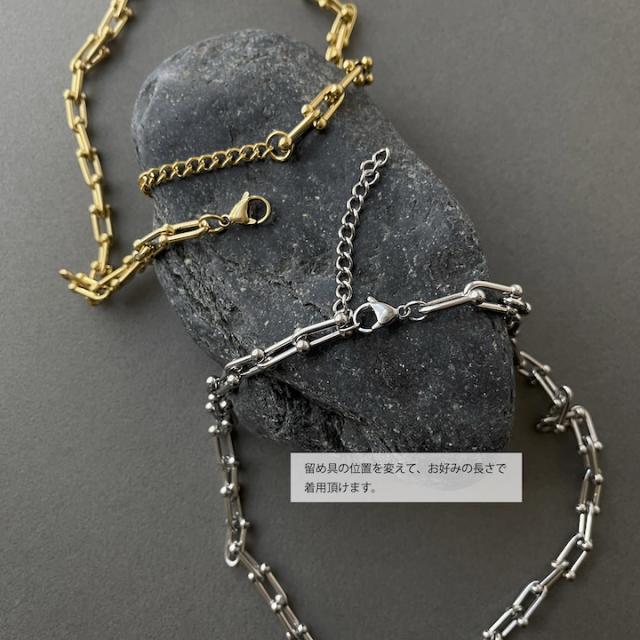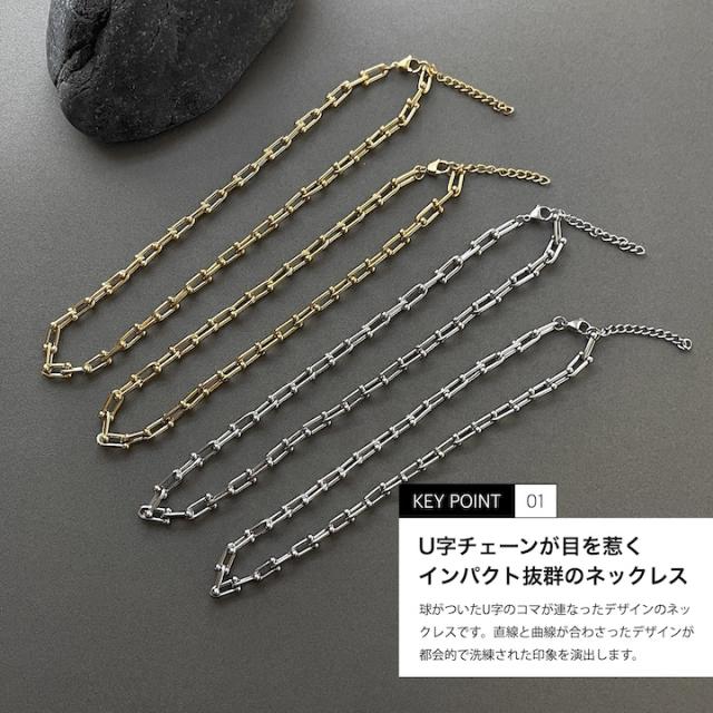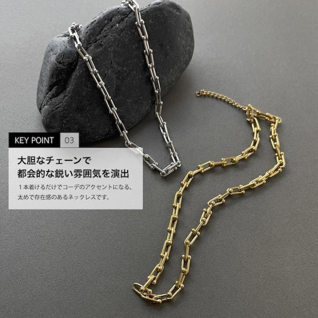 U字チェーンネックレス。大ぶりなチェーンで圧倒的な存在感でコーディネートのアクセントに! アジャスターでお好きな長さに調節可能。 カラーはゴールドとシルバーの2色展開。お持ちのアクセサリーと合わせて使うのも楽しめます。