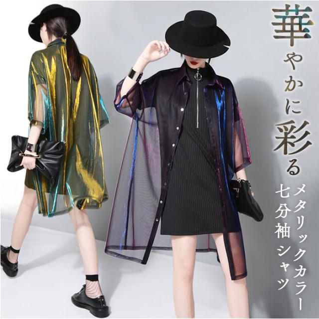 シャツ シースルー 七分袖 レディース 通販 シアーシャツ ブラウス チュニック ダンス衣装 羽織 羽織り シアー 光沢 光沢感 透け感 ロング ロング丈 きらきら