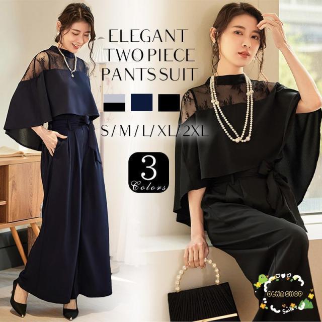 パーティードレス レディース パンツドレス 黒 紺 結婚式 パンツスタイル セットアップ セット レース 大人 ドレス ブラック ネイビー グレー