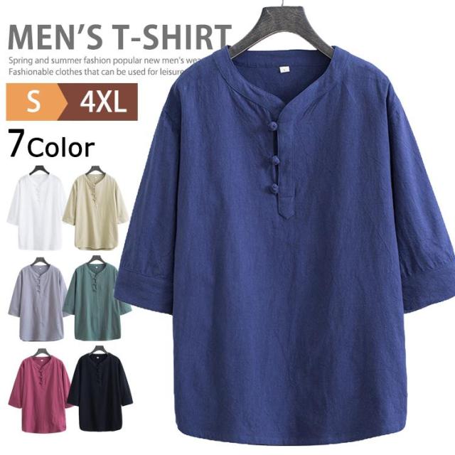 Tシャツ メンズ 7分袖 ヘンリーネック 綿麻 五分袖Tシャツ ヘンリーネックTシャツ リネンTシャツ カットソー インナー ティーシャツ カジュアル トップス ゆったり 無地 アメカジ スポーツ ダンス 運動会 文化祭 イベント お揃い 大きいサイズ 父の日