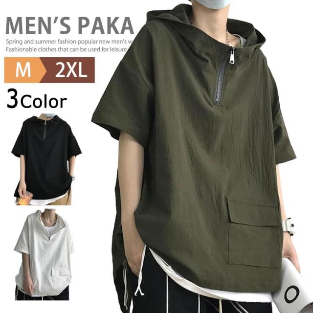 半袖 ハーフジップ パーカー メンズ トップス プルオーバーパーカー サマーパーカー 薄手 無地 半袖パーカー 夏パーカー ハーフジップシャツ ZIPパーカー フード付きTシャツ ゆったり ストリート ビッグシルエット トップス 春物 春服 夏物 夏服 キャンプ ダンス 父の日