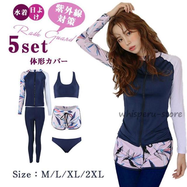 長袖ラッシュガード、ショートパンツ、レギンス、ビキニ上下の5点セット。