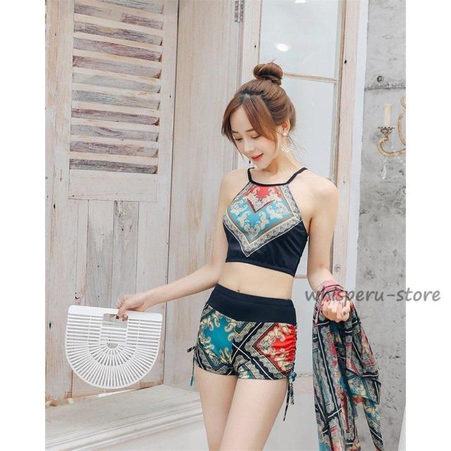 水着 レディース 体型カバー 40代 30代 20代 3点セット 上下 ママ水着 花柄 ビキニ ショートパンツ 着痩せ 可愛い 温泉 海水浴 水泳