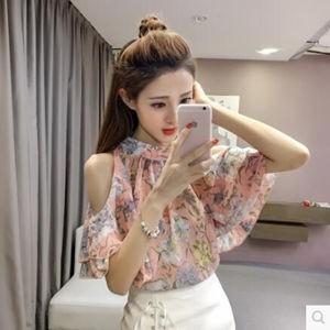 シフォンブラウス シャツ 半そで レディース 花柄 シフォン ラウンドネック 可愛い 着痩せ フレア お洒落 トップス 夏