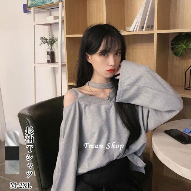 Tシャツ レディース 長袖 肩出し 無地 個性的