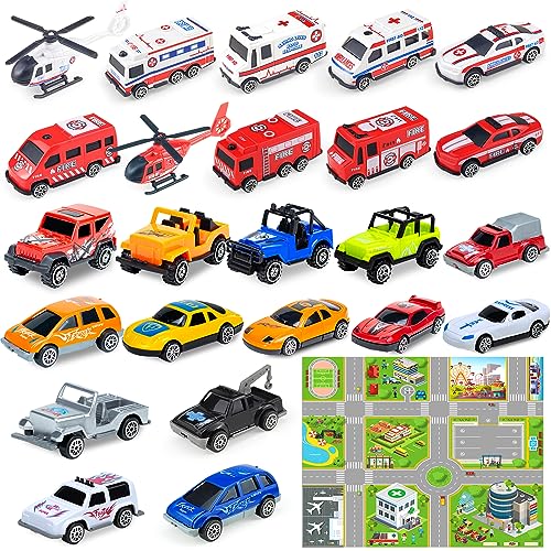 Tcvents ミニカー セット 車おもちゃ 車セット 超豊富な24点 消防車 働く車 救急車 飛行機 おもちゃ ミニ車セット ヘリコプター 建設車両