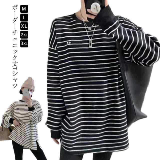 大きいサイズ 厚手 スリット チュニック ボーダー Tシャツ ロンT お洒落 ゆったり トップス 体型カバー 長め 大人 長袖 春 秋