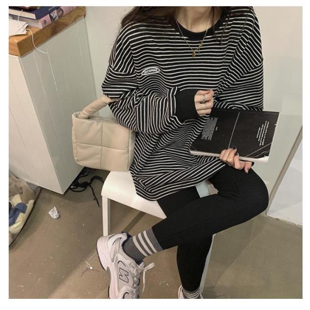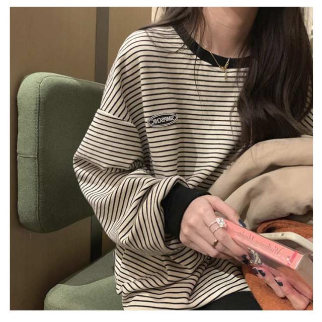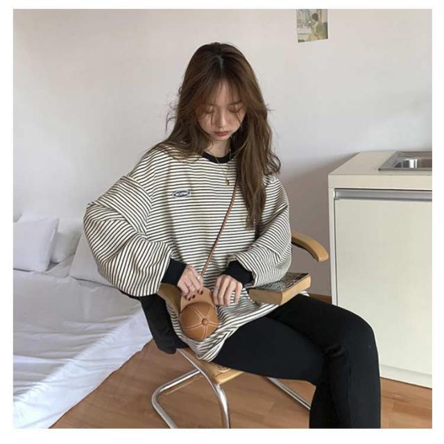 Tシャツ 大きいサイズ レディース 冬 トップス ボーダー Tシャツ クルーネック トレーナー シンプル ロンT 部屋着 丸首 秋 スウェット 春 プルオーバー トップス トップス 長袖 カジュアル 黒 ベージュ