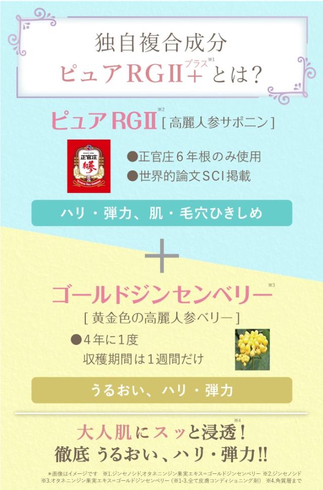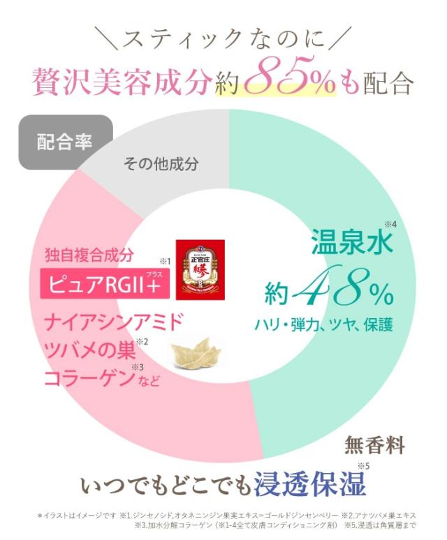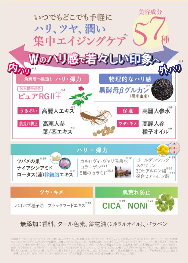 | 成分 | 温泉水、炭酸ジカプリリル、合成ワックス、エチルヘキサン酸セチル、テトラエチルヘキサン酸ペンタエリスリチル、プロパンジオール、イソノナン酸イソノニル、水添ポリデセン、グリセリン、1,2-ヘキサンジオール、ナイアシンアミド、DPG、キャンデリラロウエステルズ、ペンチレングリコール、塩化Na、ジンセノシド、オタネニンジン果実エキス、オタネニンジン種子油、オタネニンジン葉/茎エキス、オタネニンジン根水、オタネニンジンエキス、アウレオバシジウムプルランス培養物、ハスカルス培養エキス、アナツバメ巣エキス、加水分解コラーゲン、スクワラン、シルクエキス、ラズベリーケトン、ヒアルロン酸クロスポリマーNa、ヒアルロン酸Na、加水分解ヒアルロン酸、ヒアルロン酸、ヒアルロン酸ヒドロキシプロピルトリモニウム、ヒアルロン酸K、加水分解ヒアルロン酸Na、アセチルヒアルロン酸Na、セラミドEOP、セラミドNS、セラミドNP、セラミドAS、セラミドAP、ツボクサエキス、ヤエヤマアオキ胎座エキス、ビオサッカリドガム-4、バオバブ種子油、コメエキス、アデノシン、グリセリルグルコシド、スクロース、ミネラル塩、水添レシチン、カルナウバロウ、キャンデリラロウ、トコフェロール、(カプリル酸/カプリン酸)ヤシアルキル、エチルヘキシルグリセリン、BG、トリ(カプリル酸/カプリン酸)グリセリル、メチルプロパンジオール、カプリリルグリコール、ベンジルグリコール、水、メトキシPEG-114/ポリε-カプロラクトン、イソステアリン酸ポリグリセリル-4、ポリリシノレイン酸ポリグリセリル-3、イソステアリン酸ソルビタン、マイクロクリスタリンワックス、ジステアルジモニウムヘクトライト、EDTA-2Na、フェノキシエタノール |