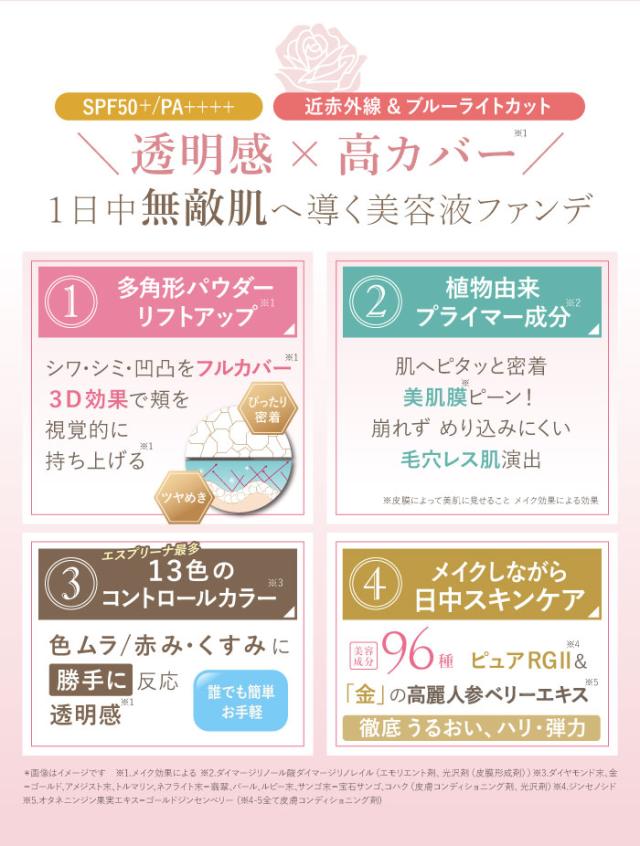 | 〇年齢サインを薄づきでフルカバー シワ・シミ・くすみなどの年齢サインを薄づきでフルカバー。肌にピタッとフィットし、塗りたてが続くツヤ肌を演出。高麗人参由来のピュアRGII+を含む美容成分を配合した、メイクしながらスキンケアが叶う美容液ファンデーションです。肌表面にヴェールをかけて物理的ハリ感をもたらす、黒酵母βグルカンを配合。肌の内(角質層)と外からのWのハリ感を目指します 〇透明感&毛穴レスの肌を叶える 9種のジュエリーパウダーが持つ13色のカラーがAIのように肌色を合わせて美肌を演出。また植物由来プライマー、美肌膜で長時間毛穴レス肌に。また多角形パウダーがすき間なく肌にフィットして、肌の凸凹をムラなく滑らかにカバー。崩れにくく、肌と一体化するような素肌のような仕上がりを叶えます 〇美容成分とカバー力を黄金比に 紫外線(SPF50+PA++++)をはじめ、ブルーライト・近赤外線をブロック。オリジナルのバラ模様プレートは、美容液成分とカバー力の黄金比を目指しました。上手に適量をとることができるので軽やかに肌に密着し、厚塗り感のない美しい肌に仕上げ、5つ星レベルのプレミアム発光美肌を演出します |