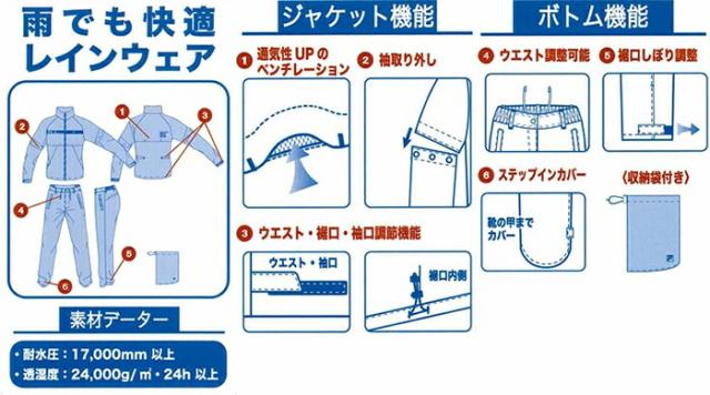 レインウェア上下セット(収納袋付き)。機能性とデザイン性を備えたレインウェアです。快適さと機能バランスの良い、耐水圧17000mm、透湿24000g/m2/24h素材を使用。ブルゾン:背部分に通気性のよいベンチレーション付き。袖部分はスナップボタンで取り外し可能。ウエスト・袖口はマジックテープで、裾口は内側スピンドルでしぼり調節が可能。パンツ:ウエスト紐つき。裾口はマジックテープでしぼり調節が可能。靴の甲まで隠れるステップインカバーつき。