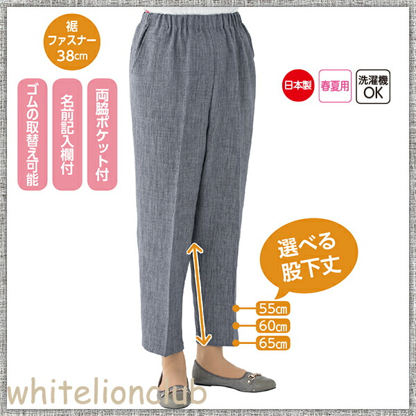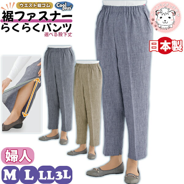 【アウトレット】クールプラス 裾ファスナーパンツ 婦人用 名前記入欄付 両脇ポケット付 ゴムの取替可能 LL/3L | お悩み解決 ズボン シニアファッション 日本製