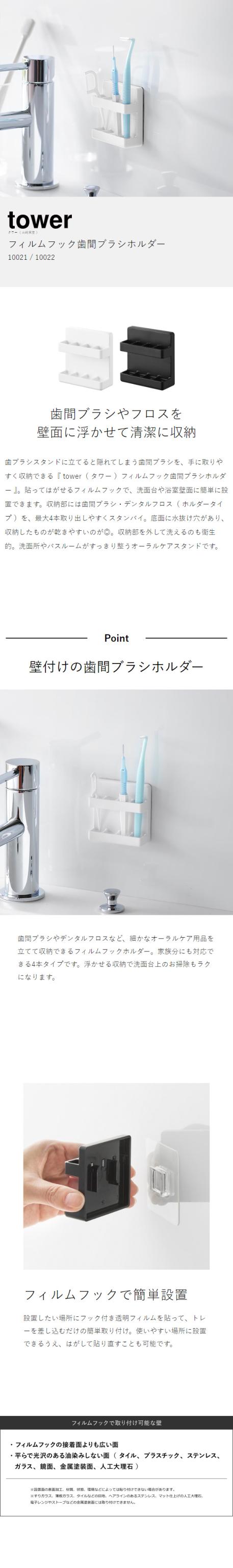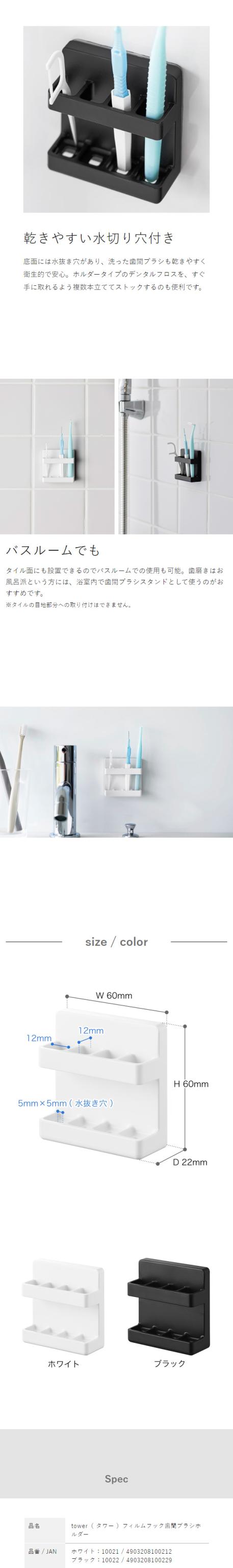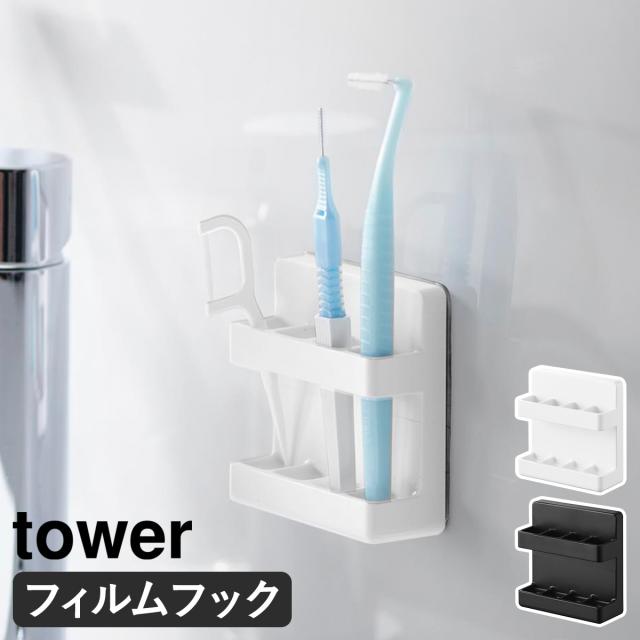 [ フィルムフック歯間ブラシホルダー タワー ]山崎実業 tower 歯間ブラシ デンタルフロス 収納 浮かせる 洗面台 洗面所 お風呂 浴室 バスルーム オーラルケア フィルムフック シンプル 北欧 おしゃれ yamazaki 公式 モノトーン ブラック ホワイト 10021 10022
