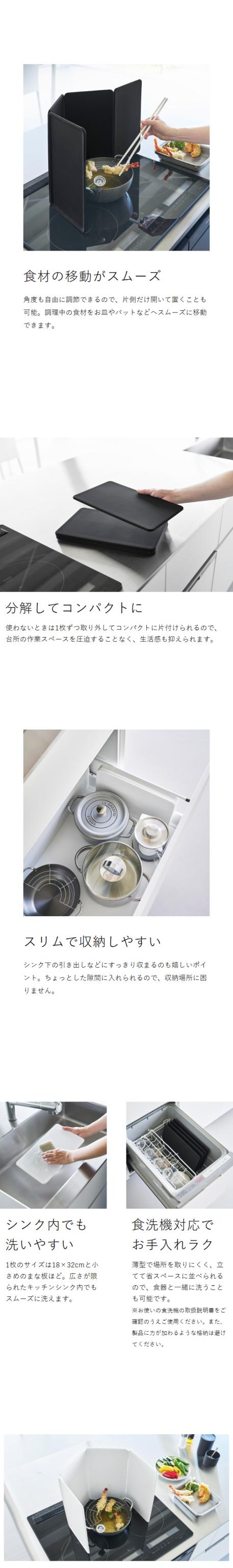 4枚のパネル構造で、マグネットで簡単に連結できて角度が自由に調節できるマグネットレンジガード。使わないときは分解して省スペースに収納でき、お手入れ簡単で食洗機にも対応。