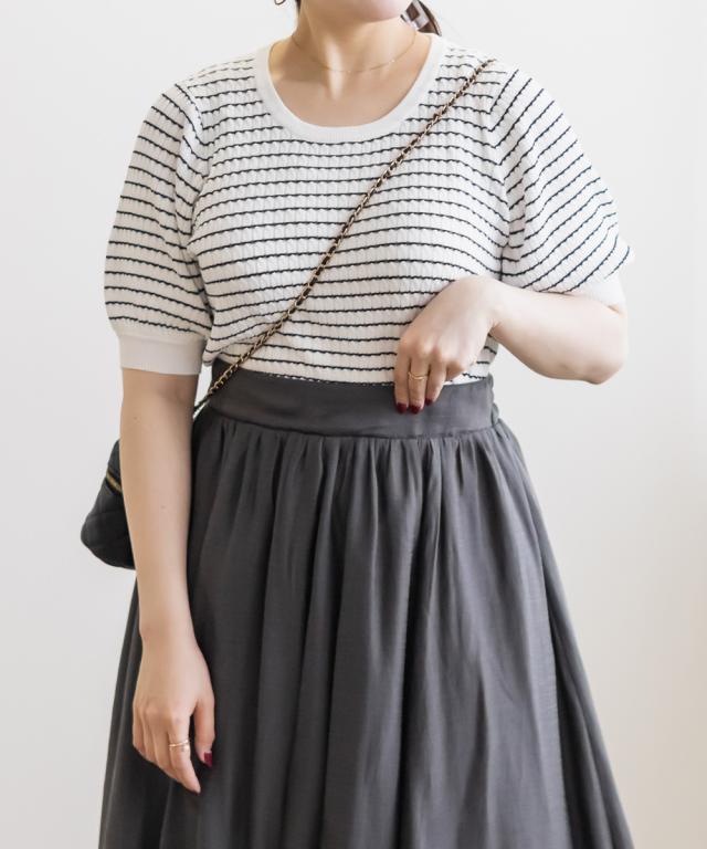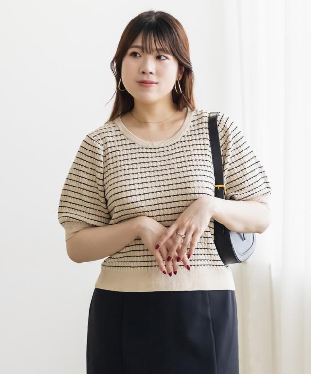 | 3Lを着てちょうどいいサイズ感でした。いつもどおりのサイズ選びで問題なさそうです◎伸びも良くて着心地が良いサマーニットです!縦のラインが強調される編みのデザインがポイントで、シンプルながら抜け感のある大人っぽいアイテムです。袖丈も短すぎず、ピタッとしないサイズ感なのが嬉しい♪さらっと1Tシャツ感覚で着られて、デイリー使いはもちろんお仕事などにもピッタリです! |