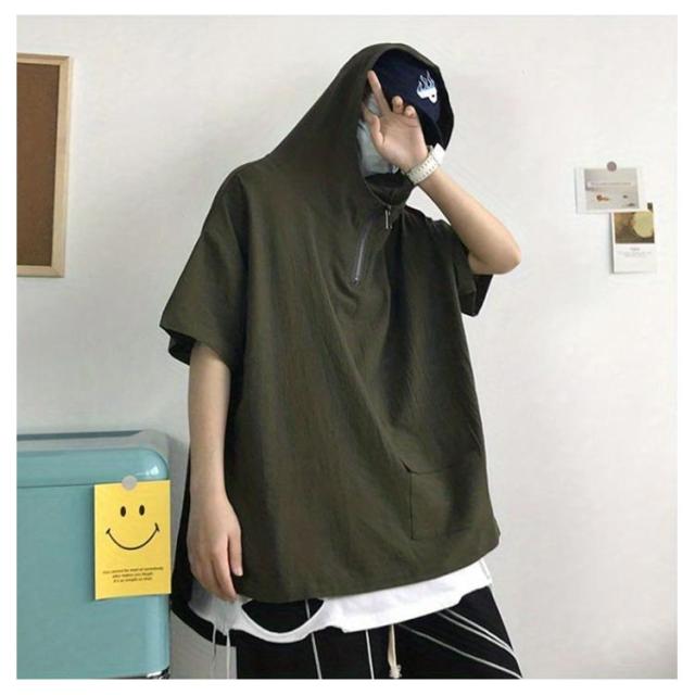 半袖パーカー パーカー 夏 夏 5分袖 メンズ メンズ ボリューム 夏用 パーカー ボリュームネック ハイネック 半袖tシャツ ジップ 韓国 ゆったり ビッグシルエット ビッグパーカー ビッグシルエット 夏用 フード付き プルオーバー 薄手 男女兼用