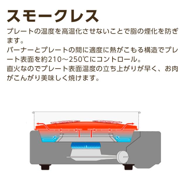 バーナーとプレートの間に適度に熱がこもる構造でプレート表面を約210〜250℃にコントロール。直火なのでプレート表面温度の立ち上がりが早く、お肉がこんがり美味しく焼けます。