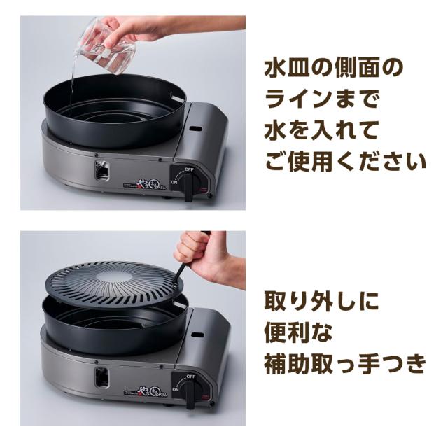 材質:本体/鋼板(粉体塗装) プレート/アルミダイカスト(フッ素樹脂加工) 水皿/鋼板(耐熱塗装) バーナー/耐熱アルミダイカスト 点火つまみ/ABS樹脂