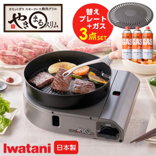 セット内容カセットガススモークレス焼肉グリル やきまるスリム(CB-SLG-3)、交換用プレート、イワタニカセットガス3本組