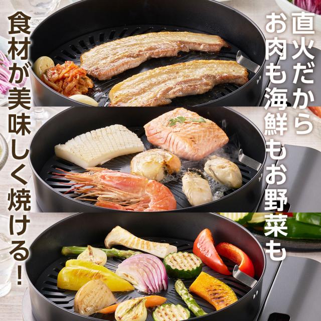 煙の発生を少なく抑え、室内で手軽に焼肉が楽しめる!カセットガス式焼肉グリル。交換プレート1枚と純正カセットガスがセットになった便利な3点セット。