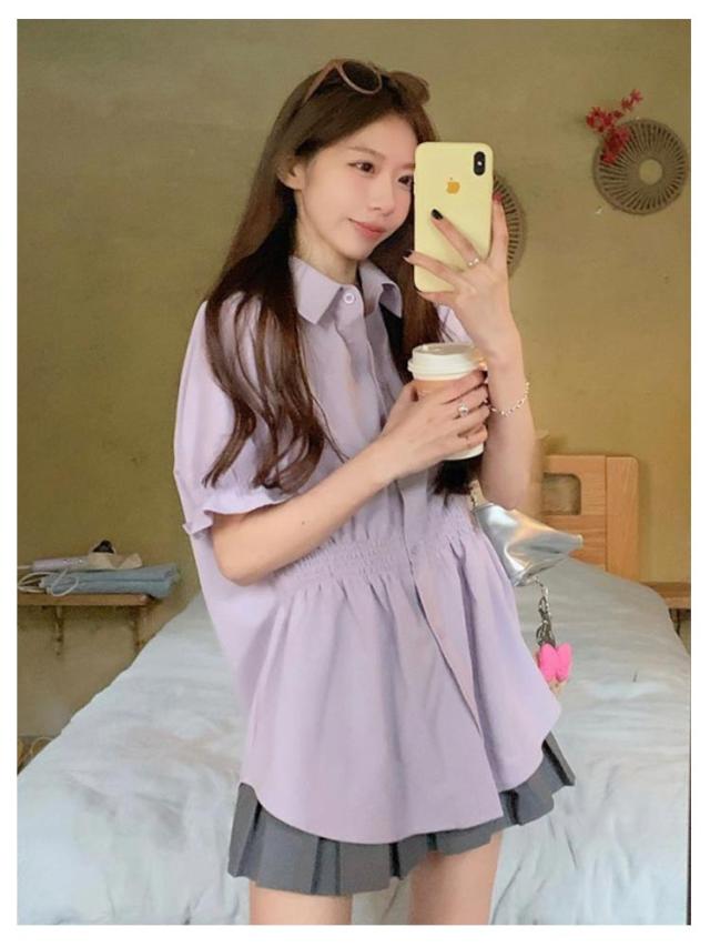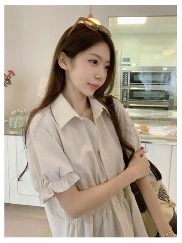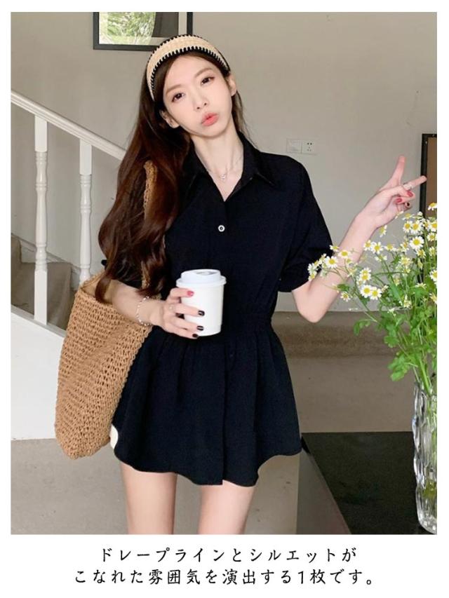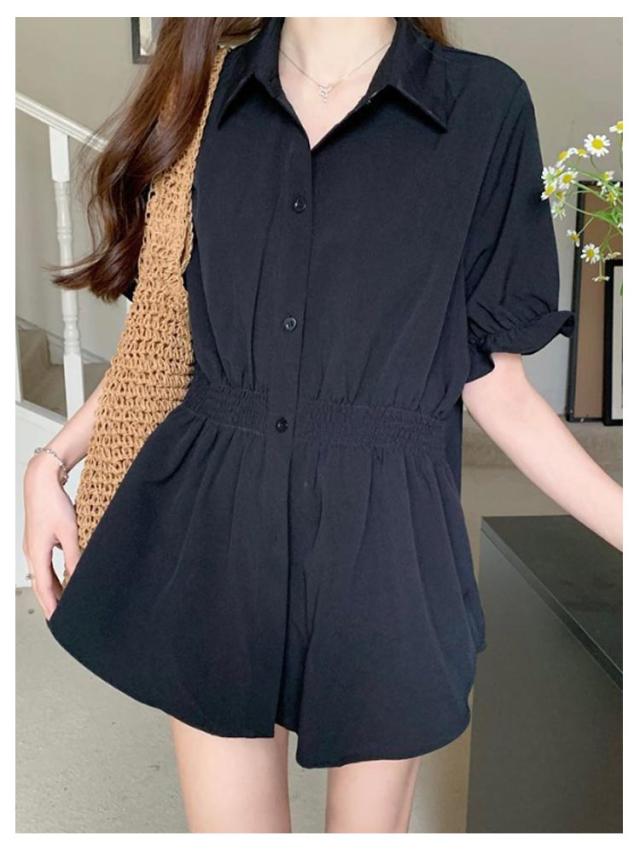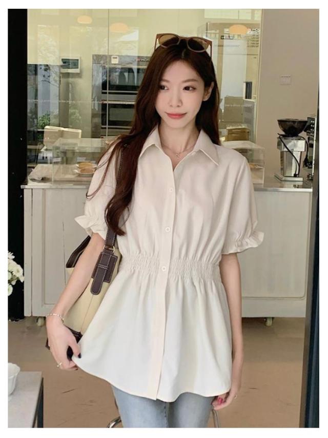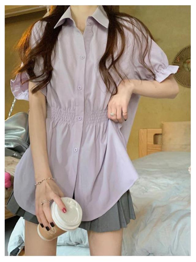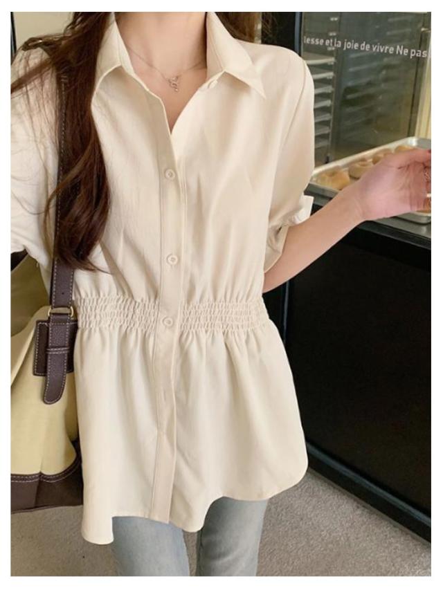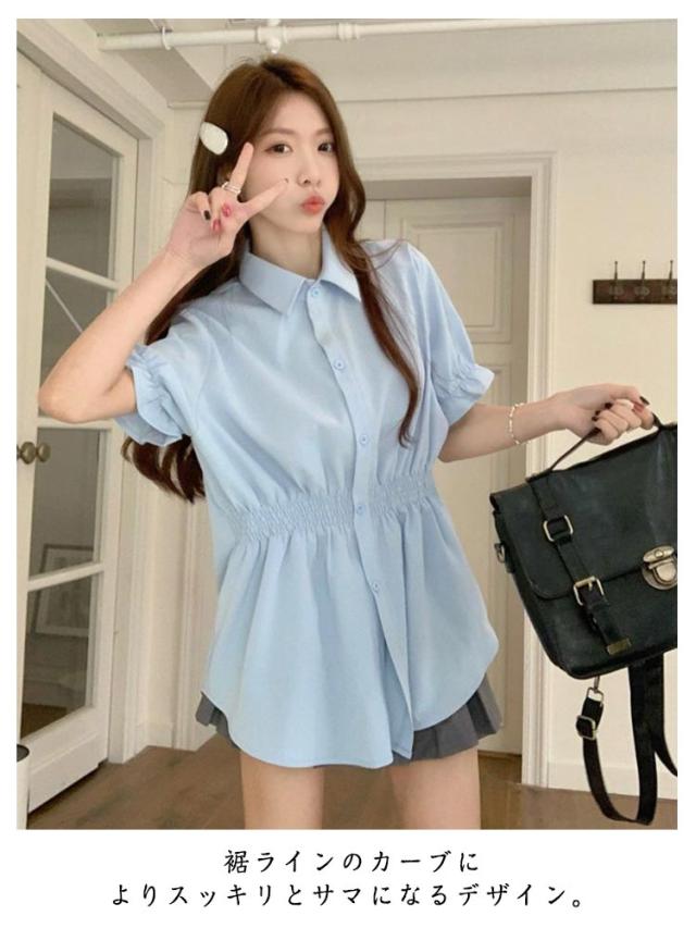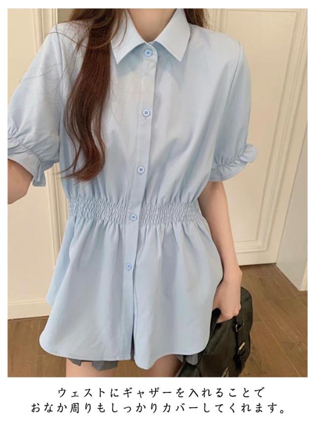 ウエストギャザー シャツ レディース 半袖ブラウス ボタン 無地 ブラウス チュニック 半袖シャツ バルーン 前開き シャーリング ギャザー チュニックシャツ 大きいサイズ チュニックブラウス 裾フレア 春 夏 ベージュ ブラック ブルー