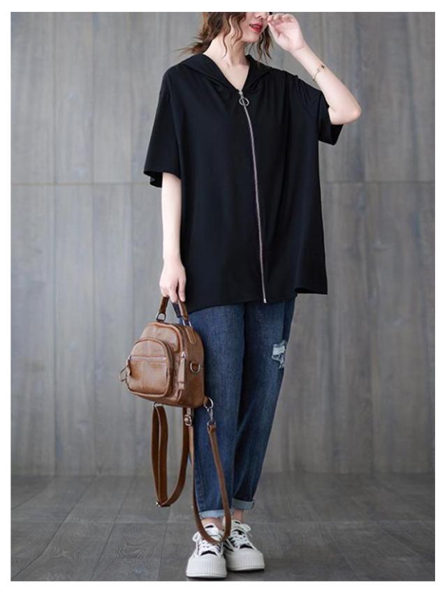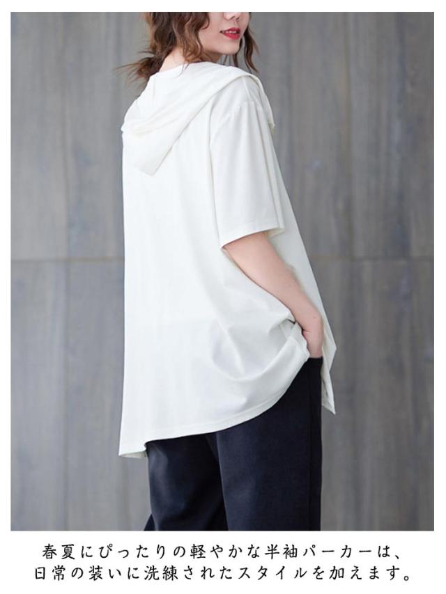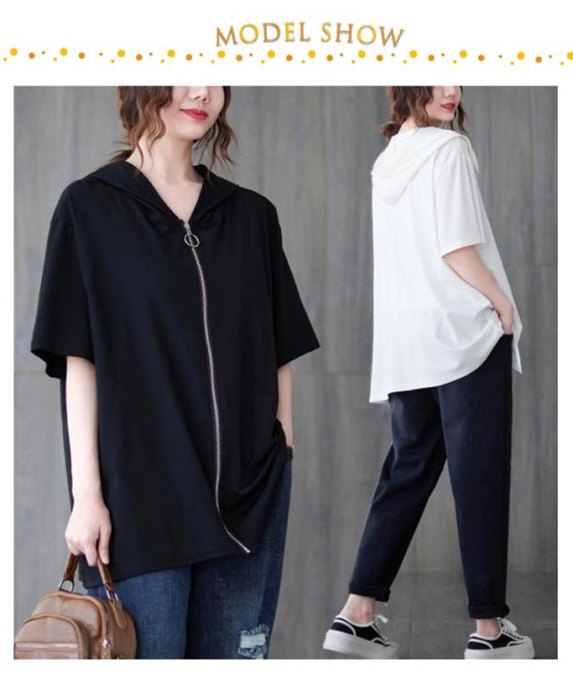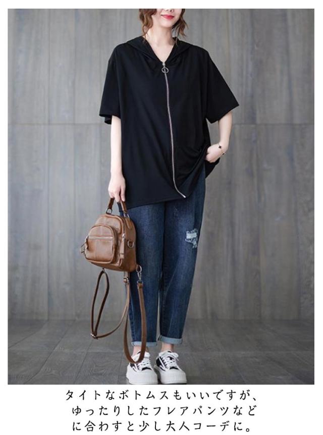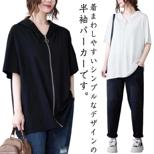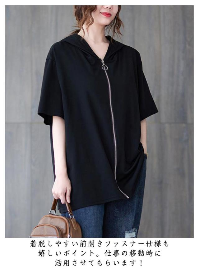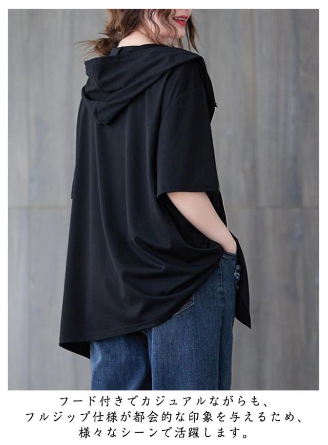 フード付き フーディー 半袖パーカー ジップアップ フード付き パーカー フード付きパーカー スウェット フード付き トレーナー リブ 前開き 前後差 裾ラウンド ゆったり ラフ プルオーバー トップス ブラック