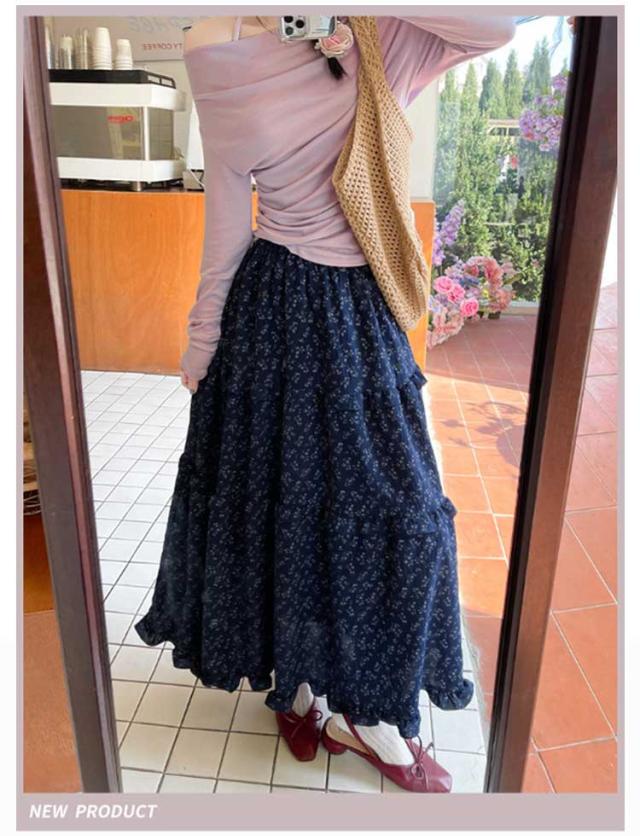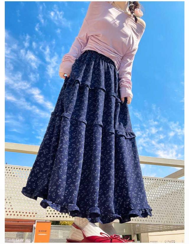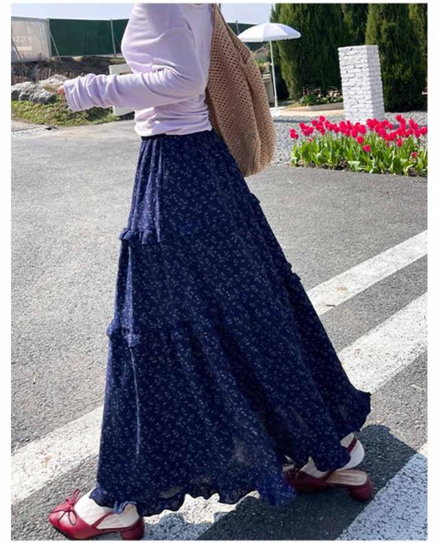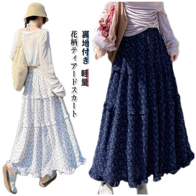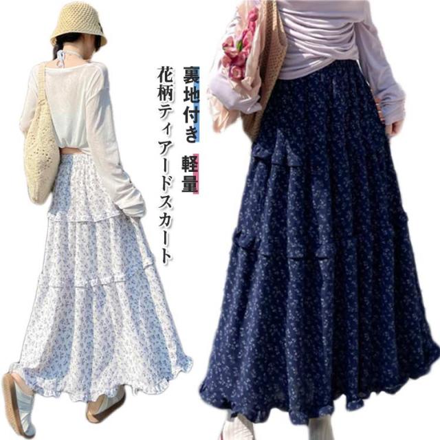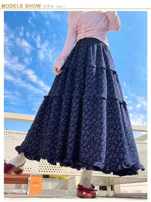 花柄スカート 裏地付き ロングスカート フリル 花柄スカート ウェストゴム 小花柄 Aライン フレアスカート 軽量 おしゃれ 体型カバー 美脚 細見え オフィスカジュアル フェミニン