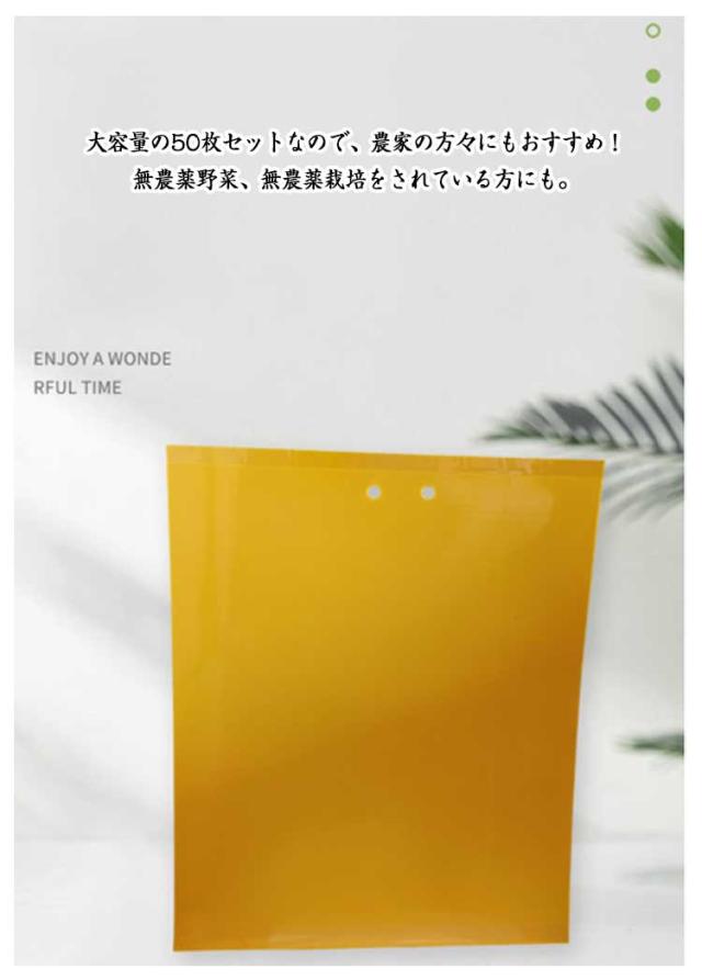 | 畑や植物周りにこの虫取りシートを置くだけで簡単に捕獲できる防虫シートです。 環境にやさしい素材で作られており、無農薬で無毒で、物理的な方法で虫を捕殺ので、安全に使用していただけ。 大容量の50枚セットなので、農家の方々にもおすすめ!無農薬野菜、無農薬栽培をされている方にも。 一度虫が粘着に貼りついたら逃げ出すことはできない防虫トラップです。 ビニールハウスの中に吊るすだけでらくらく害虫を捕獲することができます。 農業分野だけでなく、家庭、キッチン、浴室などの室内環境でも使用することができます。 | |
