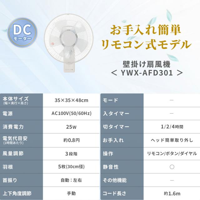 扇風機 壁掛け扇風機 お手入れ簡単モデル dcモーター 左右首振り リモコン 風量3段階 切タイマー YWX-AFD301(C) 壁掛扇風機 静音 dc扇風機 サーキュレーター 省エネ 節電 脱衣所 シンプル 小型 山善 YAMAZEN 【送料無料】