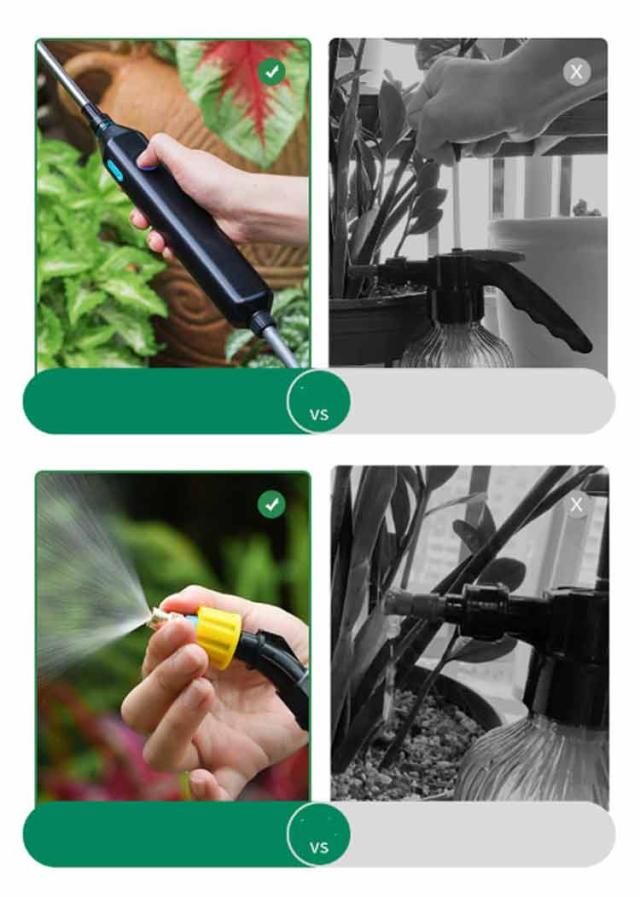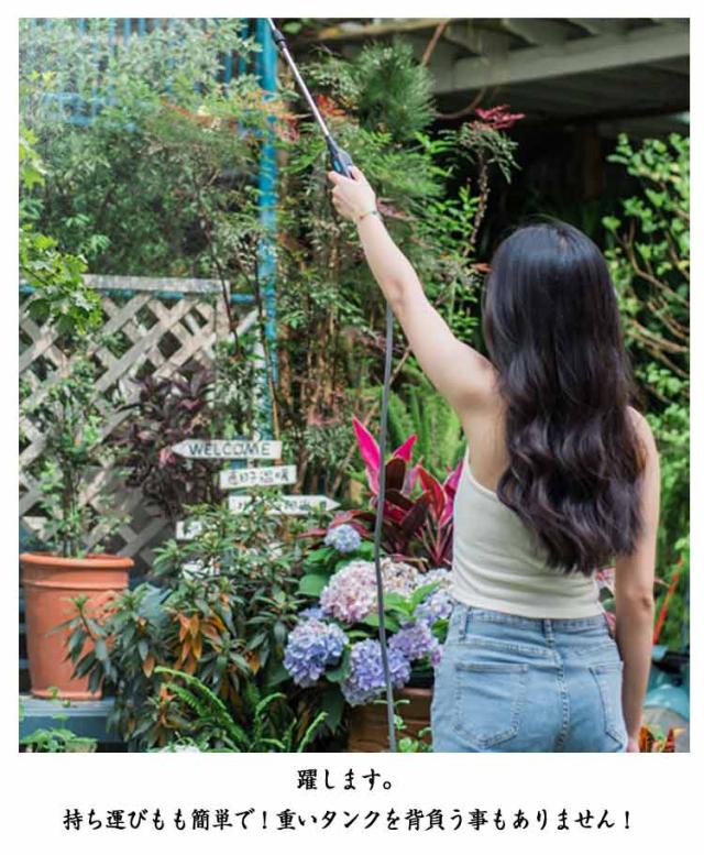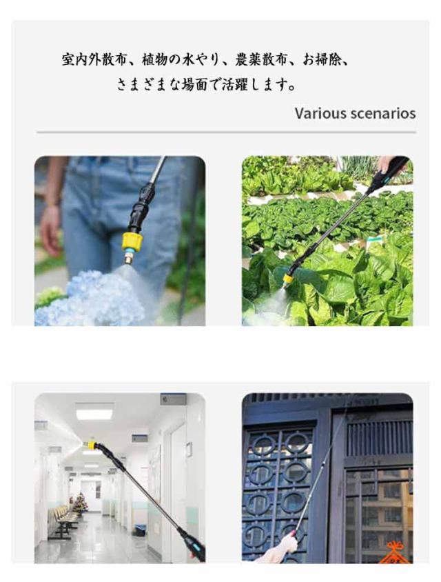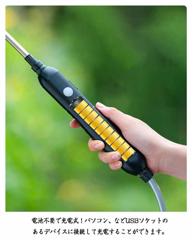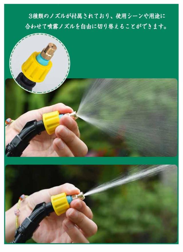 | 水道不要!バケツの水や水源があればどこでも使える電動噴霧器! スイッチ1つででオン/オフできて、手動での加圧が必要なく、ボタン一つで噴霧できるます! 3種類のノズルが付属されており、使用シーンや用途に合わせて噴霧ノズルを自由に切り替えることができます。 電池不要で充電式!パソコン、などUSBソケットのあるデバイスに接続して充電することができます。 室内外散布、植物の水やり、農薬散布、お掃除、さまざまな場面で活躍します。 5メートルの吸水ホースが付いており、水源や容器から直接水を取り入れることができるので、水道に接続などの手間もありません! 躍します。 持ち運びもも簡単で!重いタンクを背負う事もありません! 室内外散布、植物の水やり、農薬散布、お掃除、さまざまな場面で活躍します。 | |