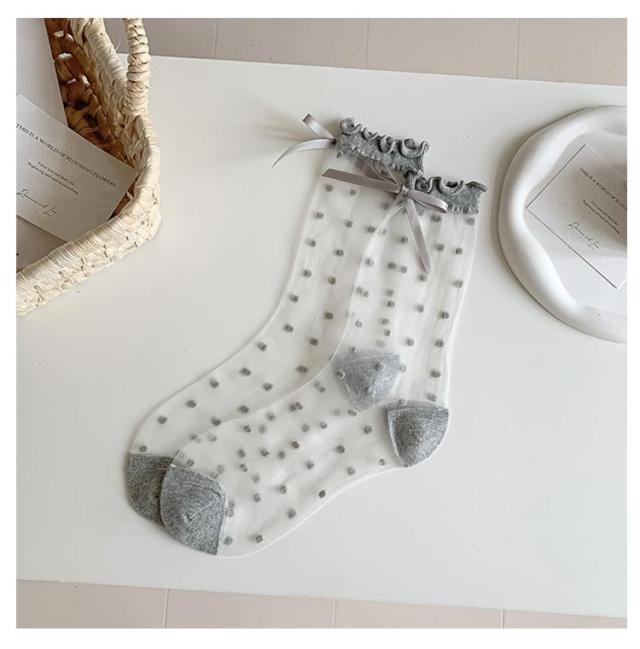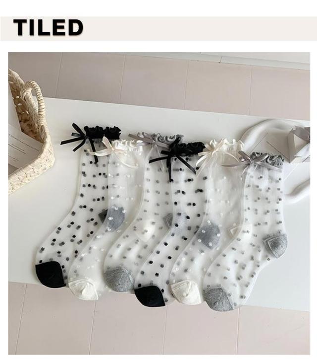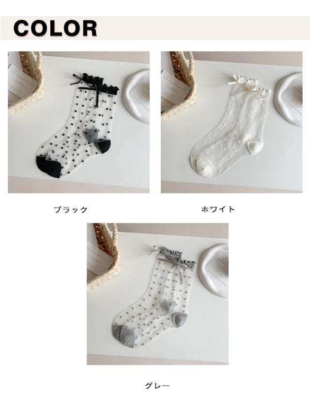 【4足組】シースルー 【4足組】シースルー ドット柄 ソックス 夏用 ガーリー シアーソックス リボン付き 透け感 薄手 靴下 くつした クルーソックス かわいい 靴下 フリーサイズ おしゃれ 女性 婦人 春