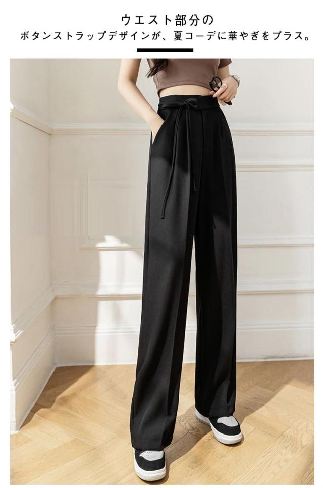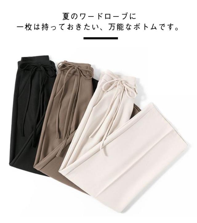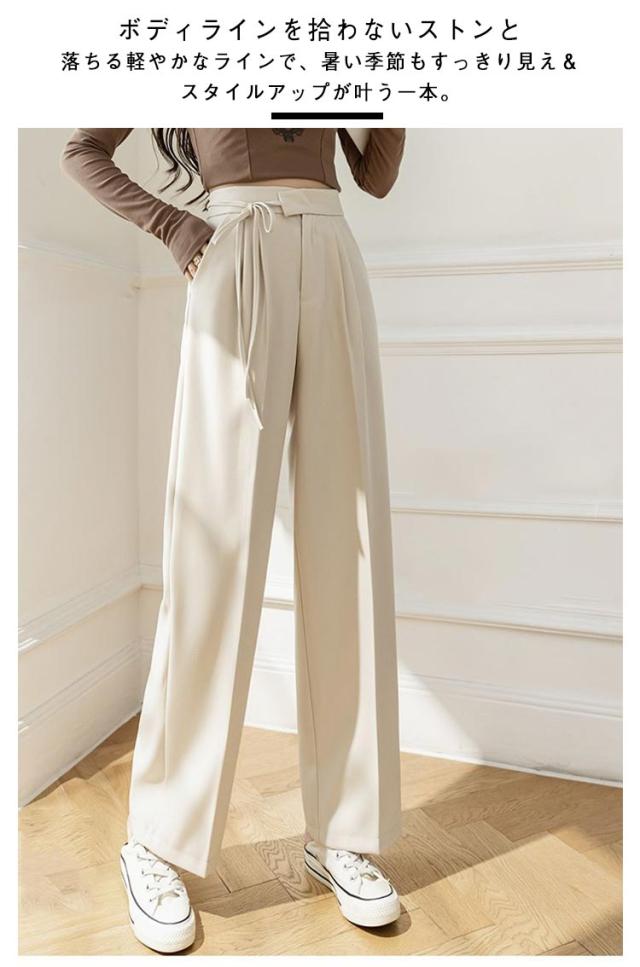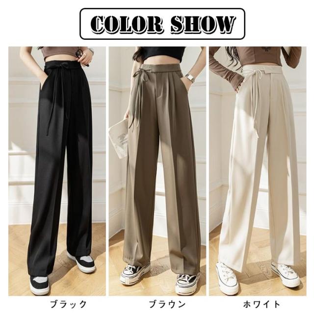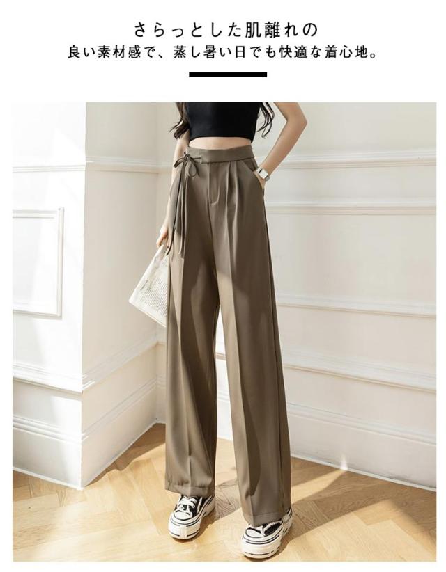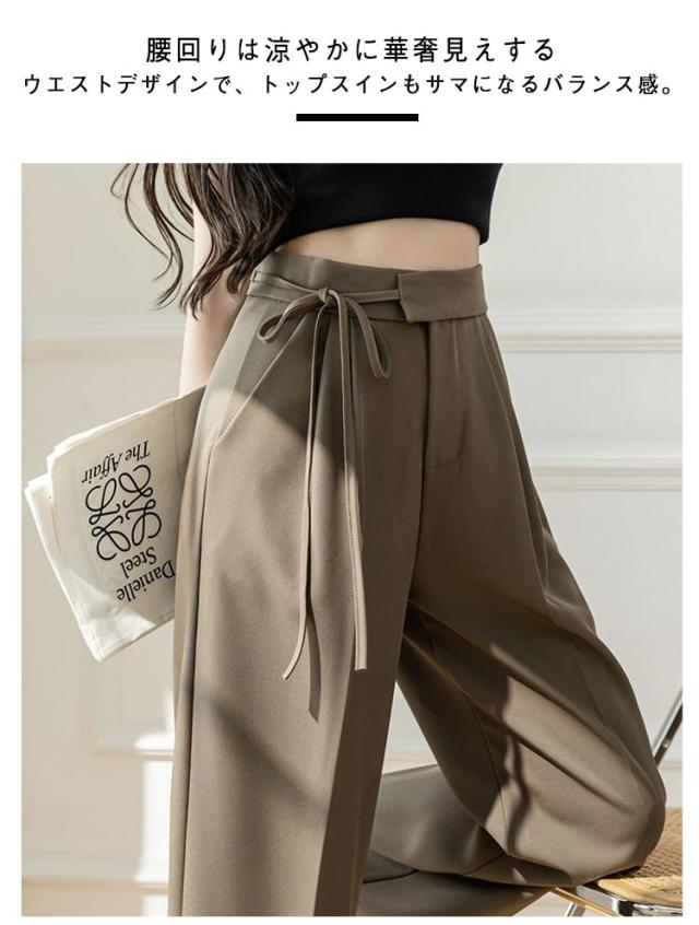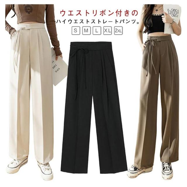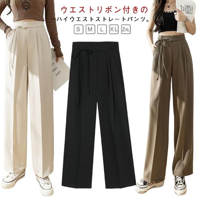美脚 ウエストリボン タック入り ストレートパンツ スラックス ワイドパンツ ハイウエスト ロングパンツ レディース ワイド パンツ セミワイド 女性 脚長 ボトムス ハイウエストパンツ ズボン 長ズボン ハイウエスト スリム