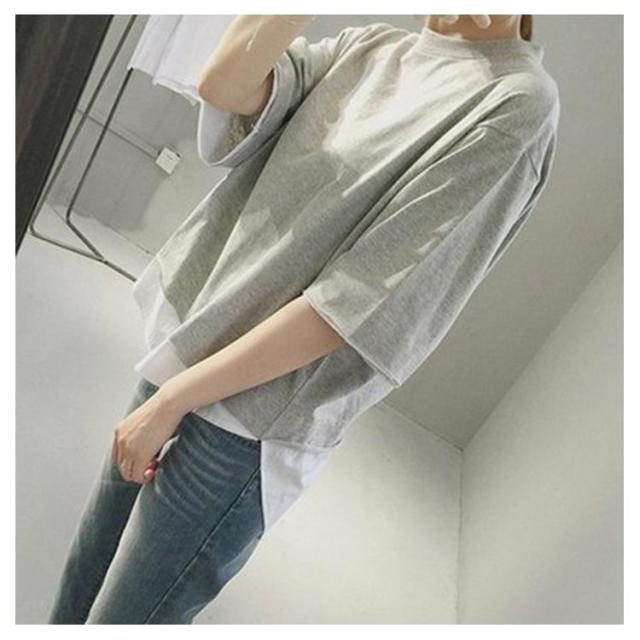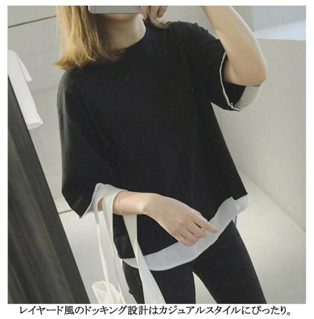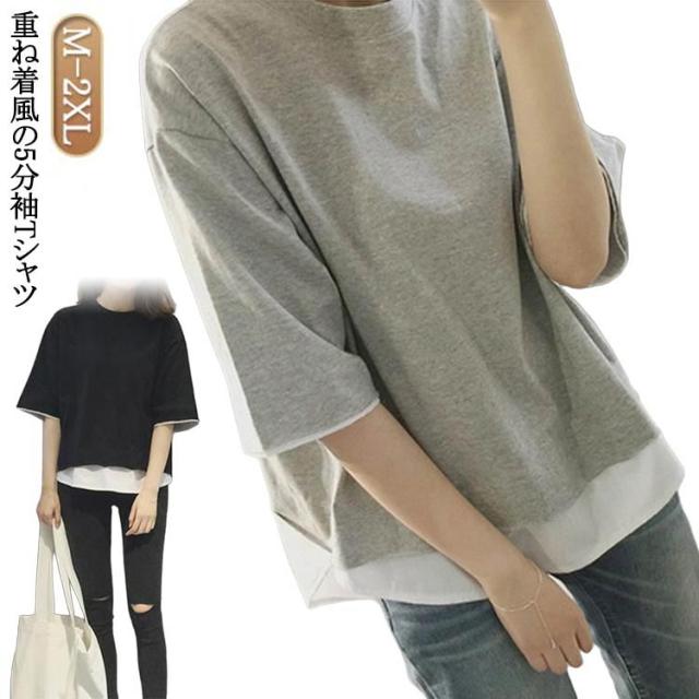 レディース 7分袖tシャツ レイヤード ブラック tシャツ カットソー 重ね着風 トップス 半袖 5分袖 七分袖 切り替え 可愛い 夏服 ラウンドネック グレー 黒