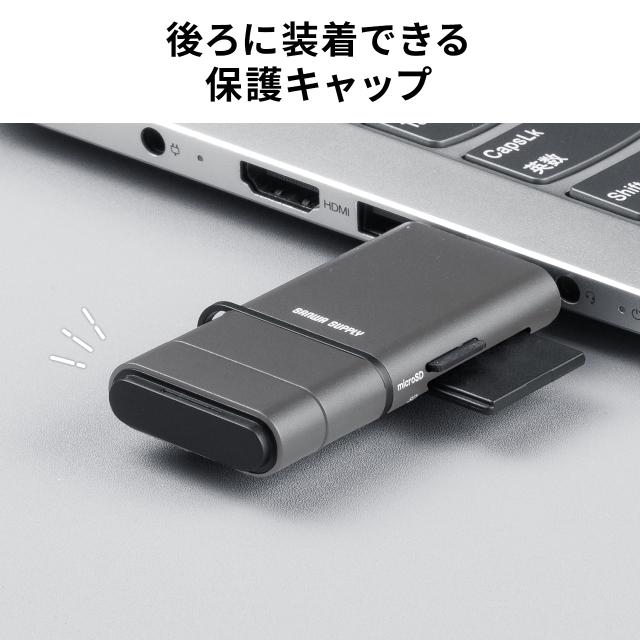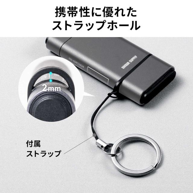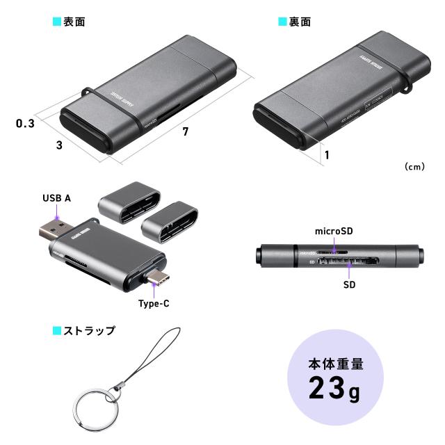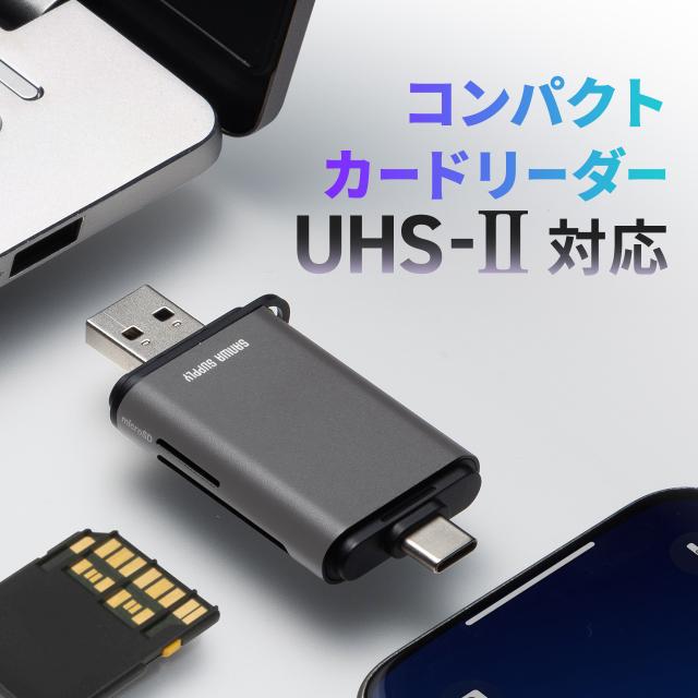 USB-A & USB-C カードリーダー UHS-II 対応 SD microSDカード 同時認識 コンパクト USB3.0 Type-C 高速転送 SDXC/SDHC ガンメタリック[400-ADR338GM]
