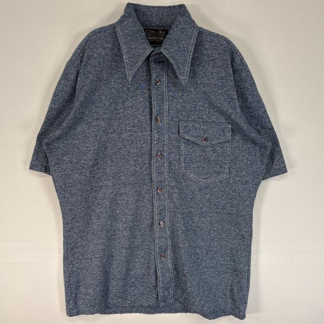 古着 70s/70年代 ヴィンテージ Contour Knit 半袖シャツ デカ襟 胸ポケ M 15-15 1/2 ネイビー 無地 メンズ