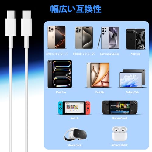 【2本セット USB C-C 充電ケーブル】iPhone 充電ケーブルは最大5V/3Aに急速充電可能です。採用された高品質な銅線は電気抵抗が低く、充電時間を短縮してくれます。また、ケーブルのコネクタは耐熱アルミニウム合金端子を採用しており、導電率が良くデータ損失も最小限に抑えます。TYPE-C 充電ケーブル2セット*1M、いつでもどこでも充電できる便利で快適、自宅、車内、オフィスなど、自由に使えます。あらゆる充電ニーズを解決し、生活の効率化を図ろう!
