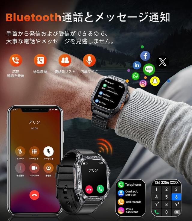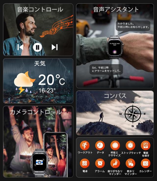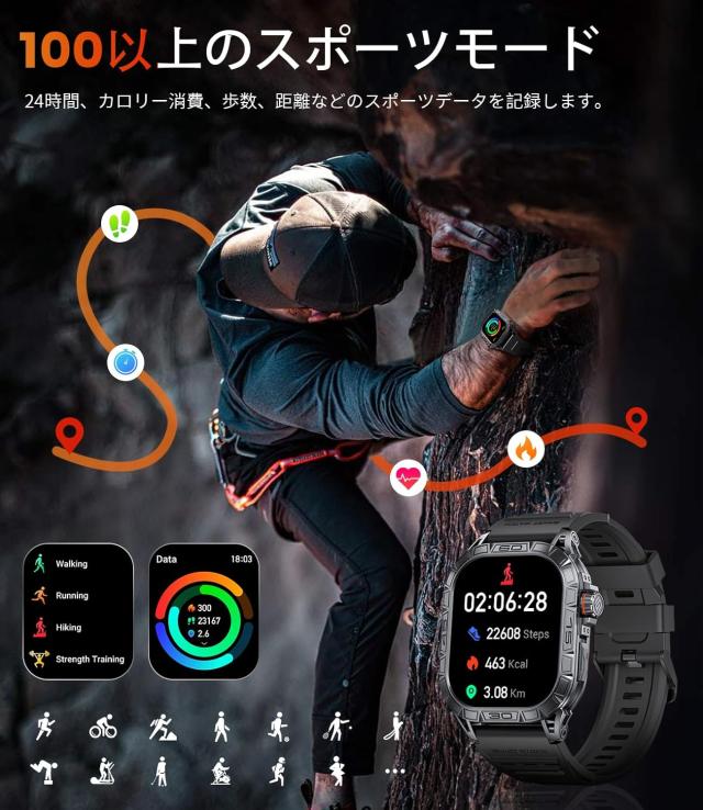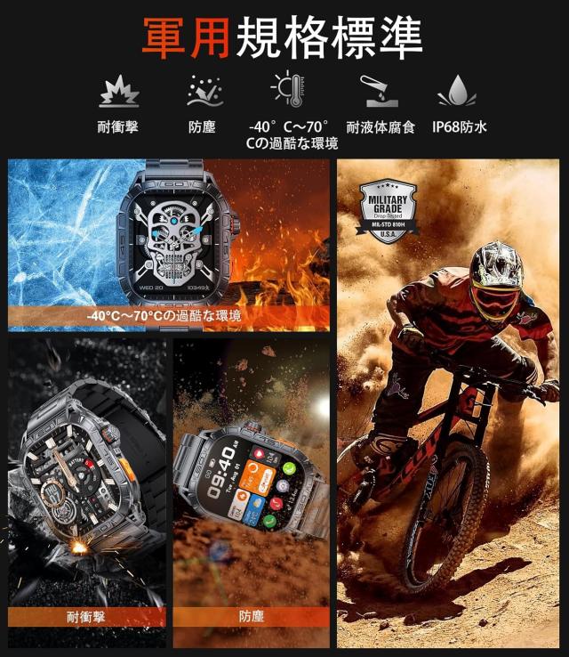 男性用のこのミリタリースマートウォッチは、衝撃や防水性を含む複数の耐久テストに合格しており、強力な耐久性と落下耐性を備えています。ステンレススチールベゼルとPC-ABS合金底殻が耐久性と衝撃耐性を向上させます。防水性能は5ATMです。時計に水が入った場合は、画面をタッチして下にスワイプし、水滴アイコンをタップすると自動的に水を排出します。(ヒント:リンクには、この時計の効果的な使用方法を助ける instructional videos が含まれています。)