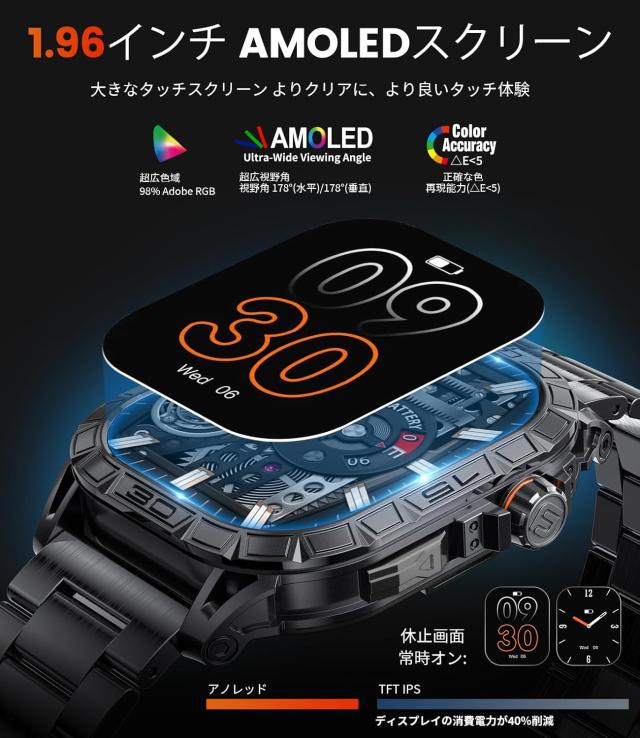この堅牢なスマートウォッチは、解像度410*502の大型HD AMOLEDタッチスクリーンを搭載しており、高コントラスト、鮮やかな色、エネルギー効率、そして優れたタッチ感度を提供します。スポーツウォッチは300以上のウォッチフェイスをサポートしており、好みに応じて異なるフェイスを選ぶことができます。満足できない場合は、自分で画像をデザインしてアップロードし、スマートウォッチの美的魅力と品質を高め、自信を持つことができます。
