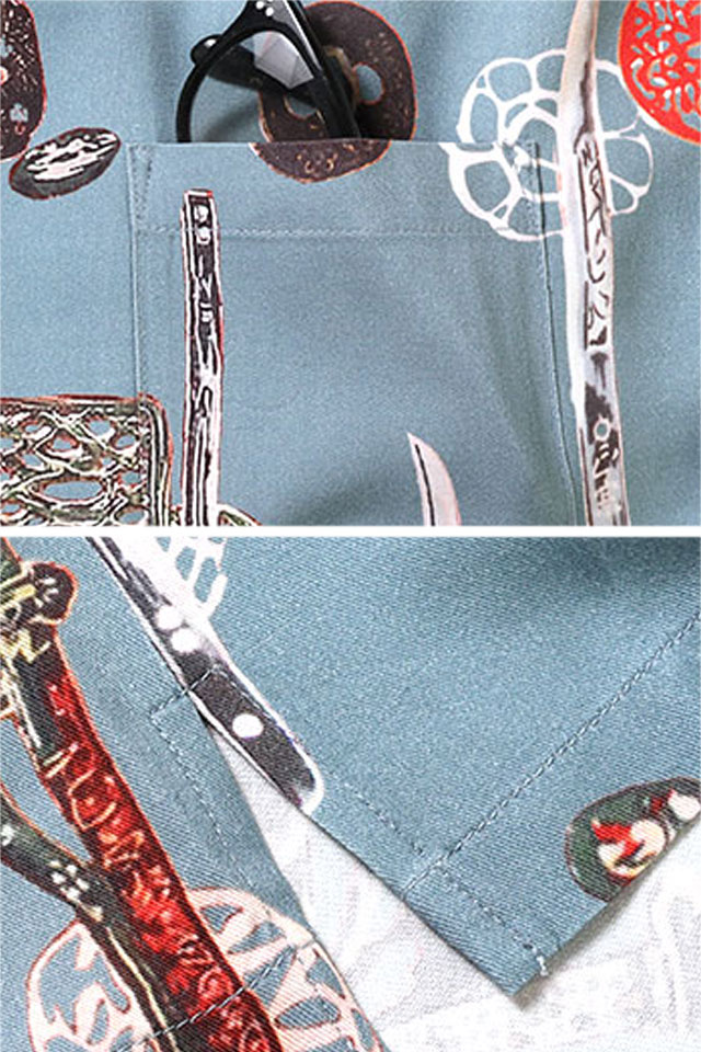 ヴィンテージのアロハシャツのアーカイブブックにも登場する、コレクタブルピースの日本刀柄をリプロダクトしています。