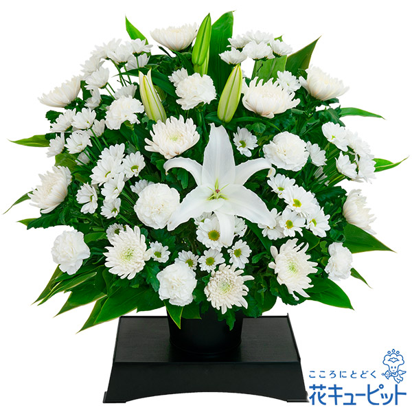 白いユリを中心にまとめた、供花台付きのお供えのアレンジメントです。白上がりのお花は、お通夜やご葬儀にも最適です。凛々しく落ち着いた雰囲気のお花が、お悔やみの気持ちを伝えます。