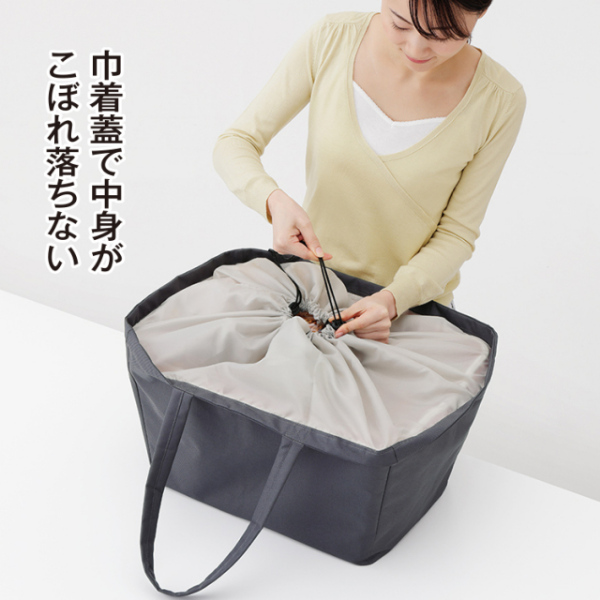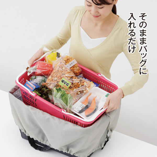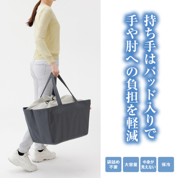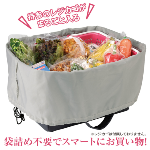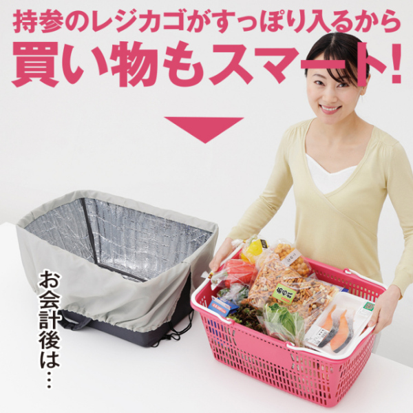 面倒な袋詰めが不要!買い物時間が短縮できるレジカゴが入る保冷バッグです。■レジ精算時に商品を持参のレジカゴに詰め替えてもらい、そのままバッグにすっぽり入れるだけ。■レジカゴが丸ごとすっぽり入る大容量サイズ。蓋は巾着タイプで中身がこぼれ落ちる心配なし。■内側に保冷性のあるアルミシートを使用。暑い日も安心してお買物ができます。■持ち手はパッド入り。重い荷物でも手や肘を柔らかくサポートします。■車でのお買物と相性がバツグン。レジカゴと一緒にいつも車に積んで置くと便利です。