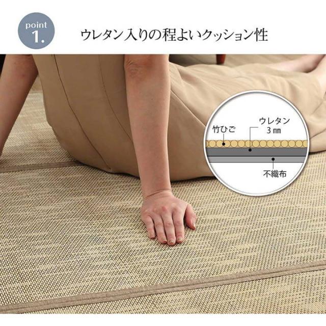 | シンプルなデザインで年間使用しやすいバンブーラグです。縦糸にカラー糸を使用し飽きの来ない無地調のデザインが特徴です。竹には抗菌防臭効果・消臭効果・防汚効果があり、清潔な状態を保てます。耐久性に優れており、ペットのいるご家庭にもオススメです。竹は他の木材と比べると格段に成長が早く(3〜5年で成竹)、持続的生産が可能な環境に優しいサスティナブルな素材です。コンパクトに畳めるため収納も可能です。裏面は不織布で床を傷つけません。 中材にはウレタンフォーム3mmを使用し、底つき感を軽減しています。 |