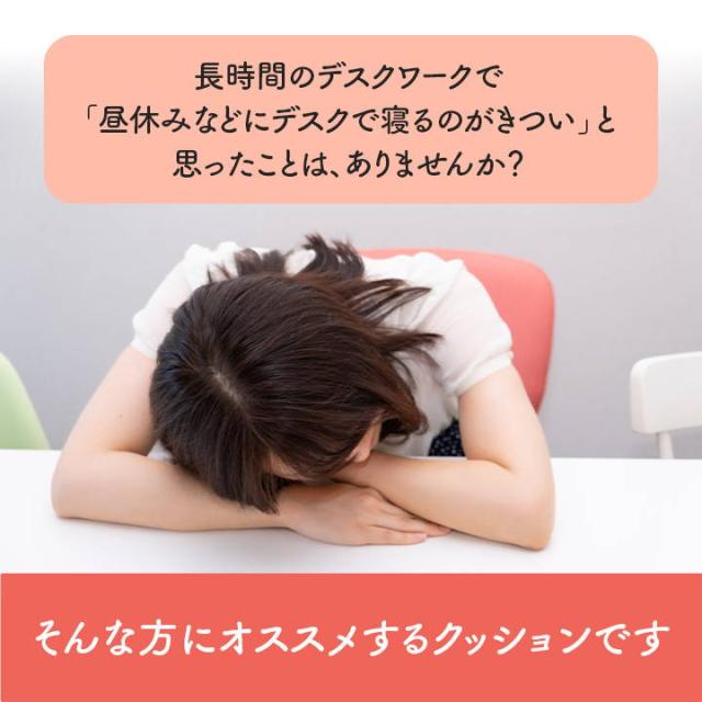 | "デスクワークでの不満を解消できる2wayクッションです。 長時間のデスクワークで「デスクでの睡眠がきつい」と思った方にオススメです。 お昼寝に心地よいクッション性です。 普段は、腰当として姿勢をサポートしてくれます。 |